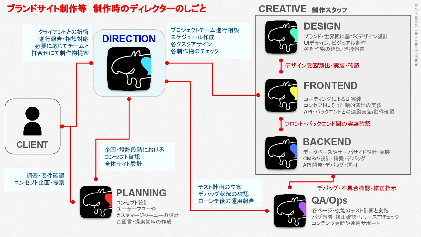 FRONTEND BACKEND QA/Ops コーディングによるUI実装 コンセプトにそった動的演出の実装 API・バックエンドとの連動実装/動作確認 データベースやサーバサイド設計・実装 CMSの設計・構築・デバッグ API開発・デバッグ・運用 各ページ・機能のテスト計画と実施 バグ報告・修正確認・リリース前チェック コンテンツ更新や運用サポート CREATIVE 制作スタッフ デザイン意図/演出・実装・確認 フロント・バックエンド間の実装確認 デバッグ・不具合確認・修正指示 PLANNING テスト計画の立案 デバッグ状況の確認 ローンチ後の運用報告 プロジェクトチーム進行相談 スケジュール作成 各タスクアサイン 各制作物のチェック 調査・要件確認 コンセプト企画・提案 企画・設計段階における コンセプト確認 全体サイト設計 ブランドサイト制作等 制作時のディレクターのしごと コンセプト設計 ユーザーフローや カスタマージャーニーの設計 企画書・提案資料の作成