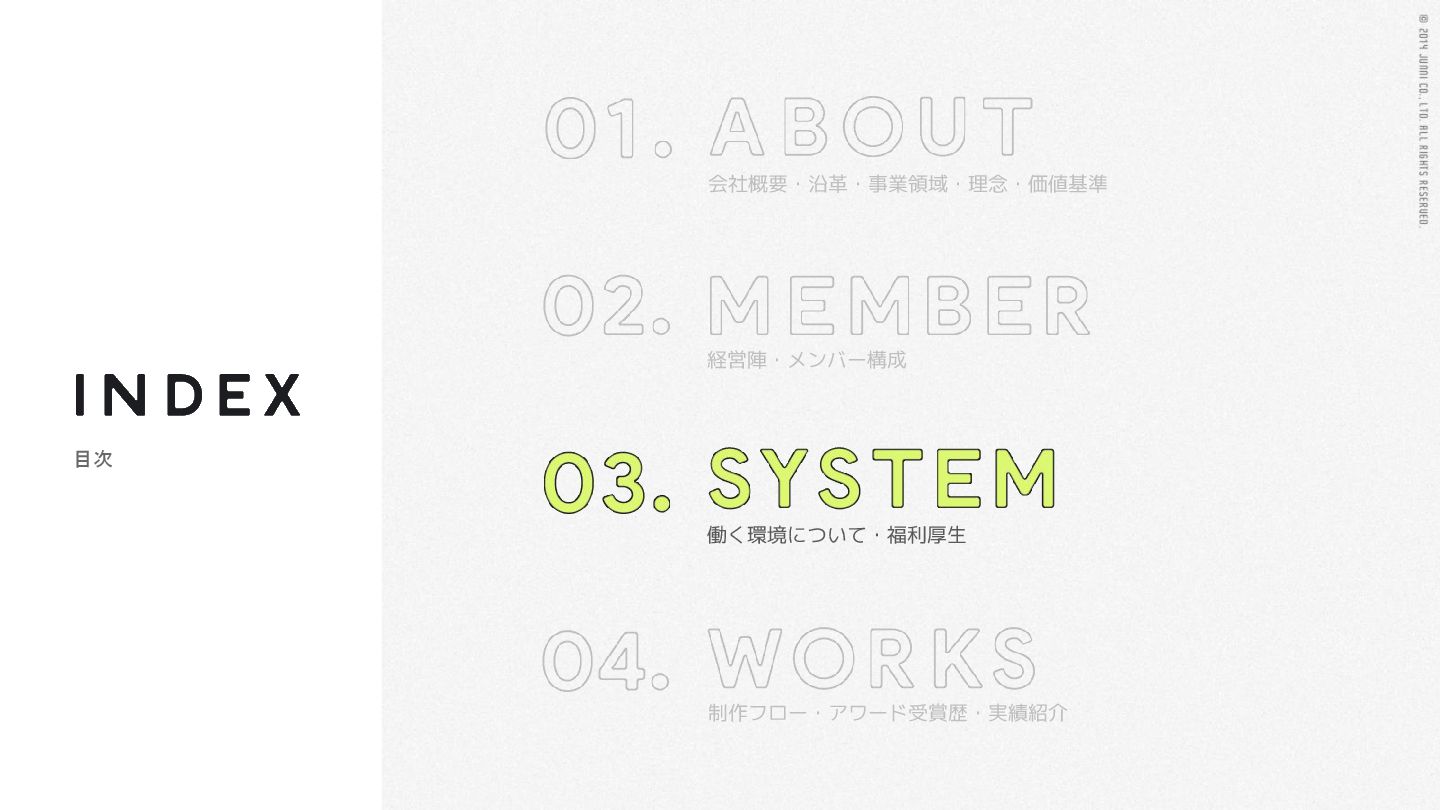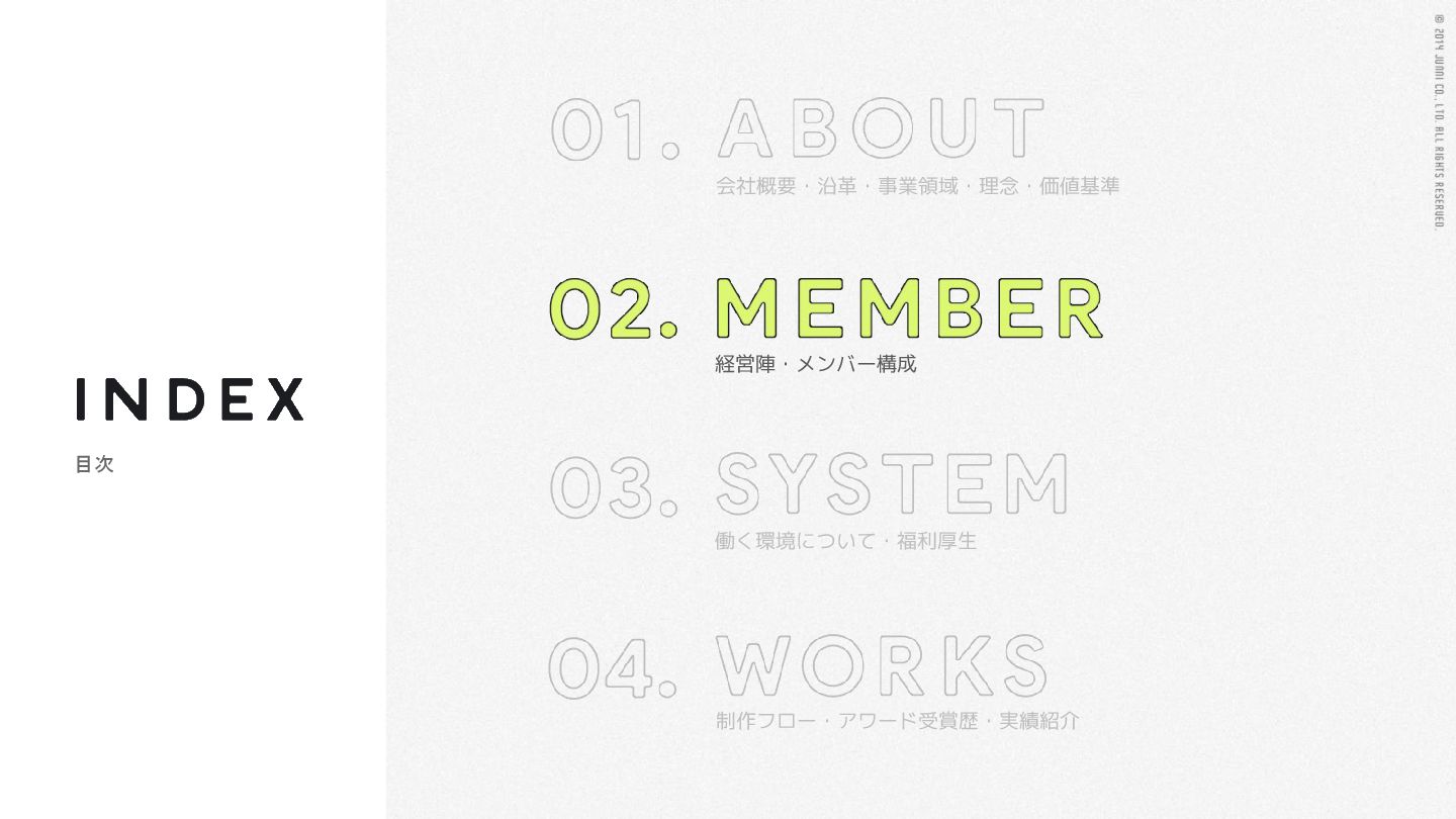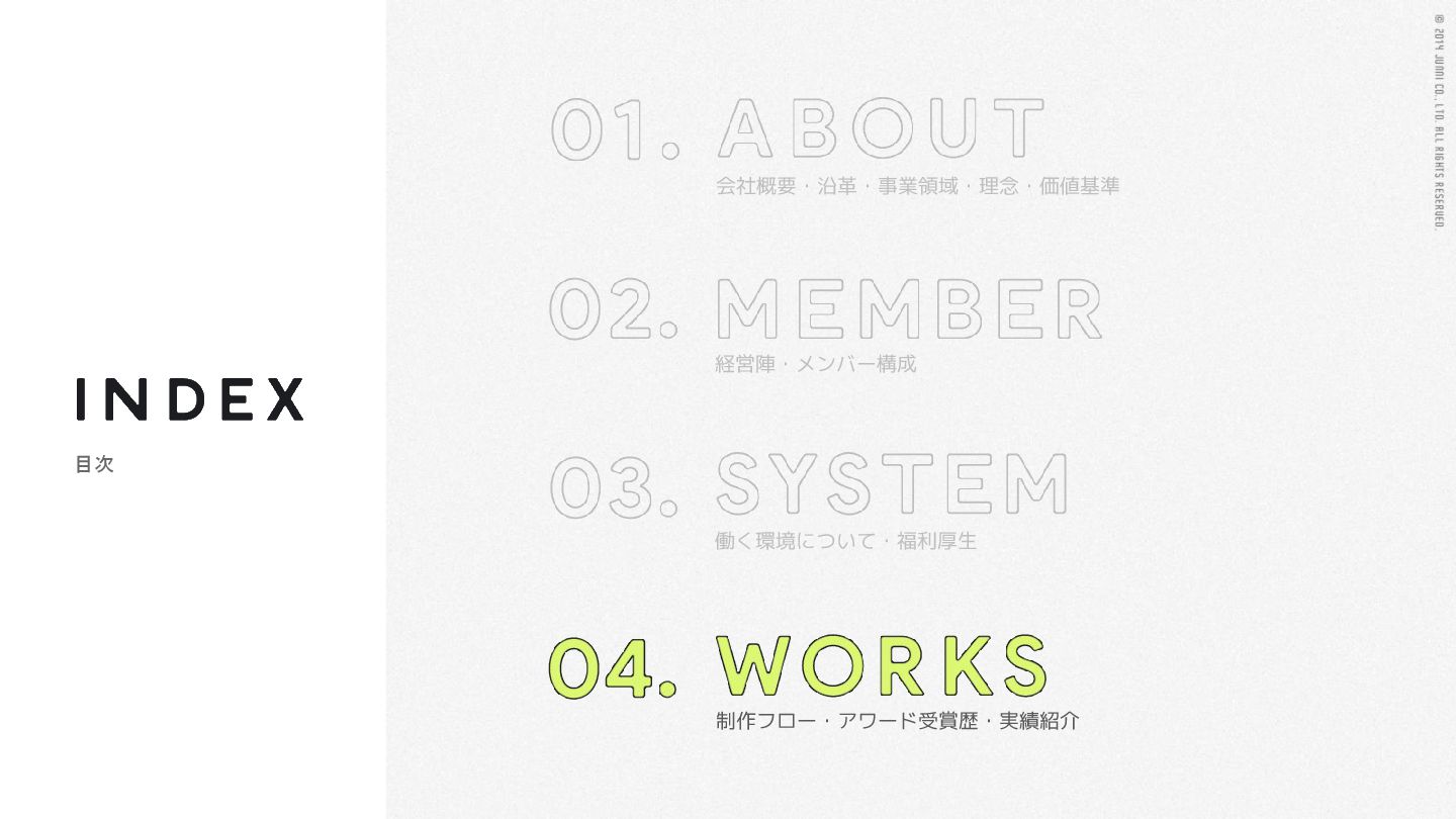 目次 会社概要・沿革・事業領域・理念・価値基準 経営陣・メンバー構成 制作フロー・アワード受賞歴・実績紹介 働く環境について・福利厚生