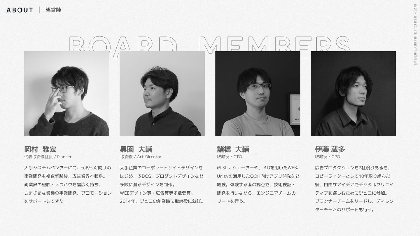 GLSL/シェーダーや、3Dを用いたWEB、 Unityを活用したOOH向けアプリ開発など 経験。体験する者の視点で、技術検証・ 開発を行いながら、エンジニアチームの リードを行う。 岡村 雅宏 黒図 大輔 諸橋 大輔 代表取締役社長 / Planner 取締役 / Art Director 取締役 / CTO 広告プロダクションを2社渡りあるき、 コピーライターとして10年取り組んだ 後、自由なアイデアでデジタルクリエイ ティブを楽しむためにジュニに参加。 プランナーチームをリードし、ディレク ターチームのサポートも行う。 伊藤 蔵多 取締役 / CPO 経営陣