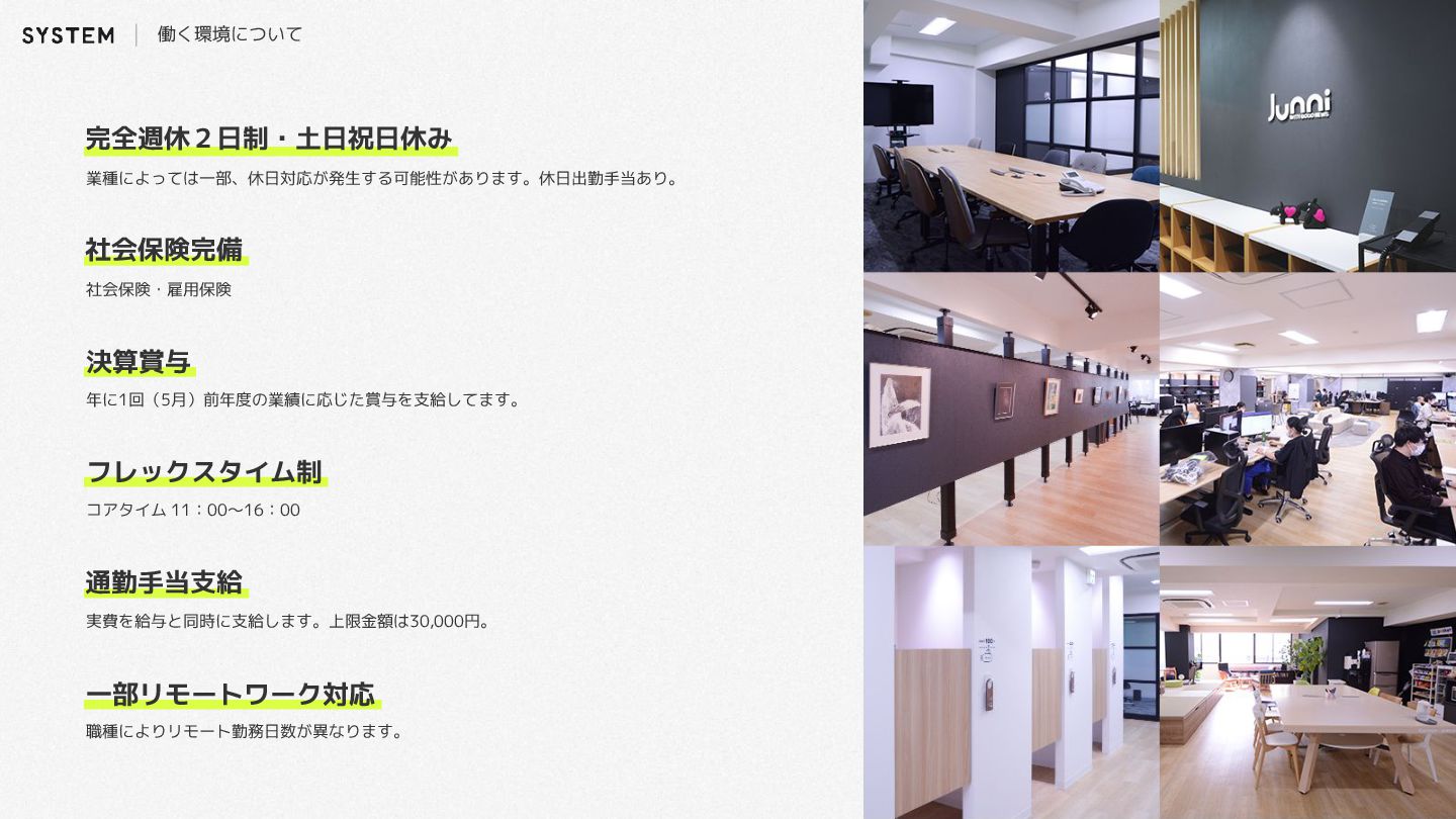 社会保険完備 社会保険・雇用保険 フレックスタイム制 コアタイム 11:00〜16:00 通勤手当支給 実費を給与と同時に支給します。上限金額は30,000円。 一部リモートワーク対応 職種によりリモート勤務日数が異なります。 働く環境について