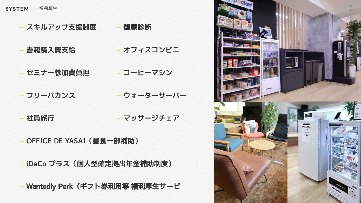 スキルアップ支援制度 書籍購入費支給 セミナー参加費負担 フリーバカンス 社員旅行 OFFICE DE YASAI(昼食一部補助) iDeCo プラス(個人型確定拠出年金補助制度)