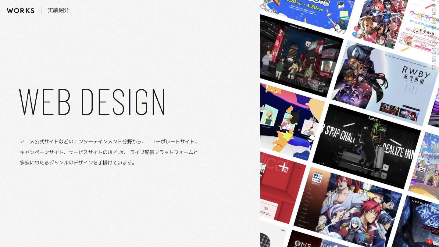 アニメ公式サイトなどのエンターテインメント分野から、 コーポレートサイト、 キャンペーンサイト、サービスサイトのUI/UX、 ライブ配信プラットフォームと 多岐にわたるジャンルのデザインを手掛けています。 実績紹介