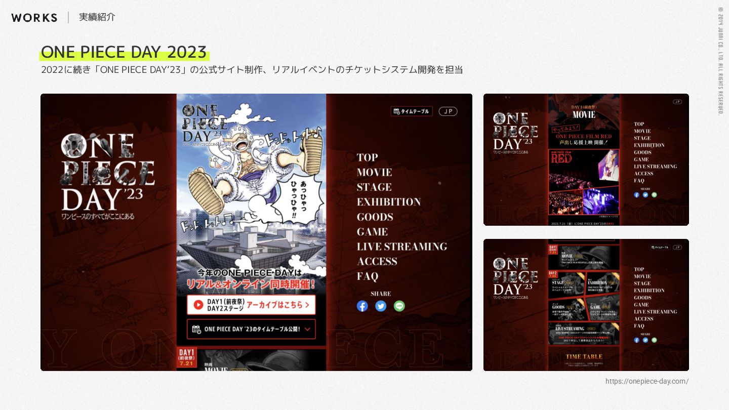 実績紹介 ONE PIECE DAY 2023 2022に続き「ONE PIECE DAY‘23」の公式サイト制作、リアルイベントのチケットシステム開発を担当 https://onepiece-day.com/