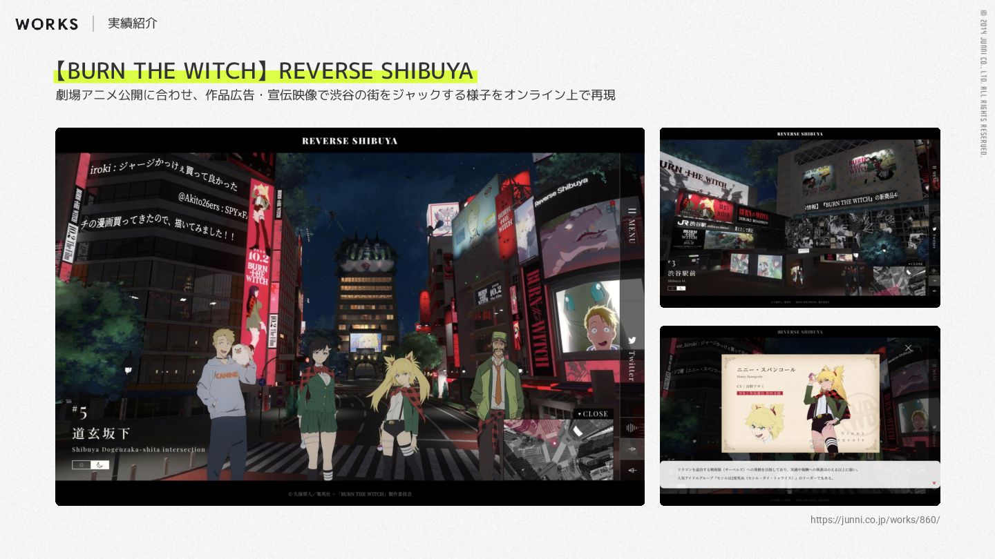 https://junni.co.jp/works/860/ 【BURN THE WITCH】REVERSE SHIBUYA 劇場アニメ公開に合わせ、作品広告・宣伝映像で渋谷の街をジャックする様子をオンライン上で再現 実績紹介