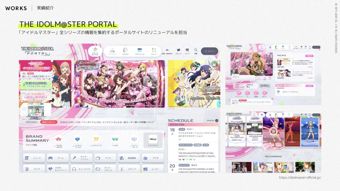 THE IDOLM@STER PORTAL 「アイドルマスター」全シリーズの情報を集約するポータルサイトのリニューアルを担当 https://idolmaster-official.jp/ 実績紹介