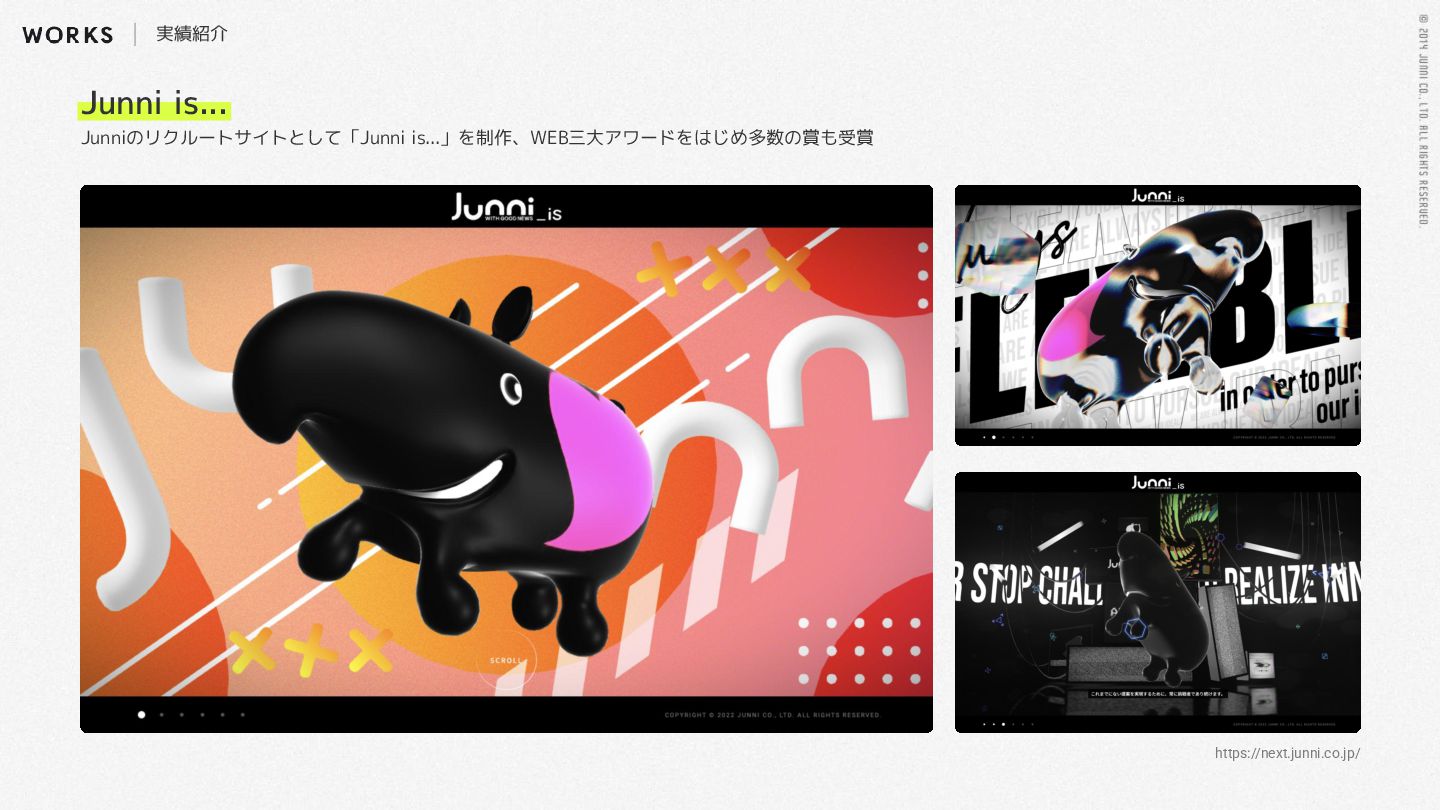 Junni is... Junniのリクルートサイトとして「Junni is...」を制作、WEB三大アワードをはじめ多数の賞も受賞 https://next.junni.co.jp/ 実績紹介