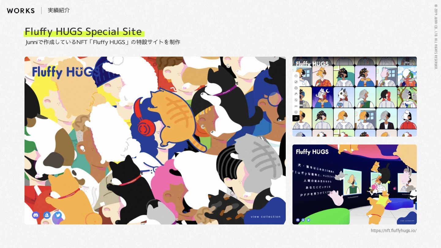 Fluffy HUGS Special Site Junniで作成しているNFT「Fluffy HUGS」の特設サイトを制作 https://nft.fluffyhugs.io/ 実績紹介