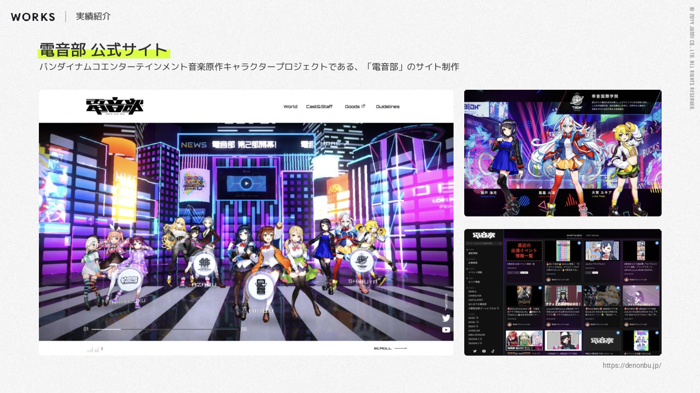 電音部 公式サイト バンダイナムコエンターテインメント音楽原作キャラクタープロジェクトである、「電音部」のサイト制作 https://denonbu.jp/ 実績紹介