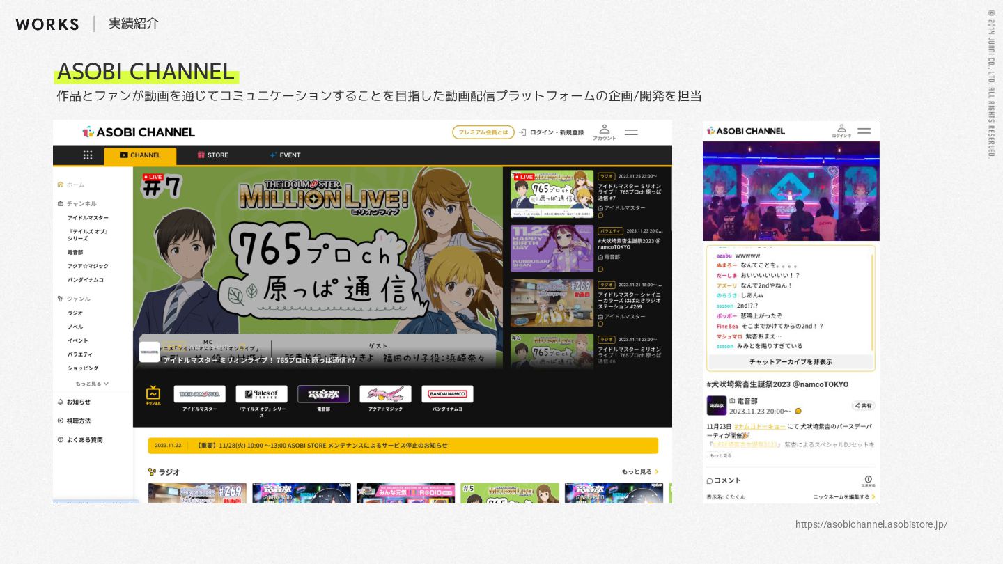 ASOBI CHANNEL 作品とファンが動画を通じてコミュニケーションすることを目指した動画配信プラットフォームの企画/開発を担当 https://asobichannel.asobistore.jp/ 実績紹介