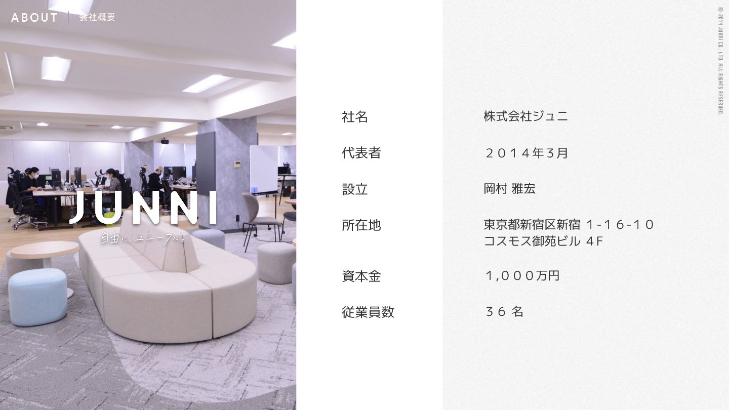 会社概要 社名 株式会社ジュニ 2014年3月 東京都新宿区新宿 1-16-10 コスモス御苑ビル 4F 1,000万円 岡村