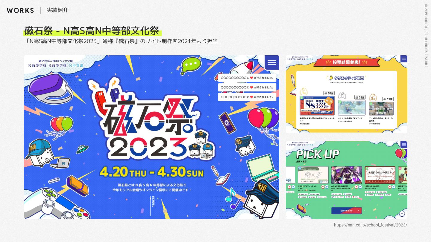 磁石祭 - N高S高N中等部文化祭 「N高S高N中等部文化祭2023」通称『磁石祭』のサイト制作を2021年より担当 https://nnn.ed.jp/school_festival/2023/ 実績紹介