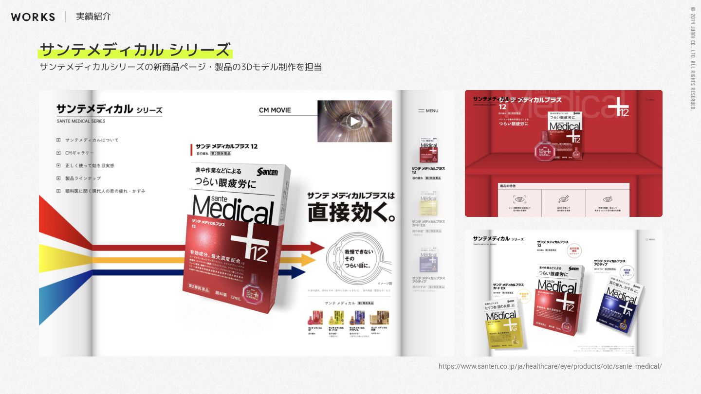サンテメディカル シリーズ サンテメディカルシリーズの新商品ページ・製品の3Dモデル制作を担当 https://www.santen.co.jp/ja/healthcare/eye/products/otc/sante_medical/ 実績紹介
