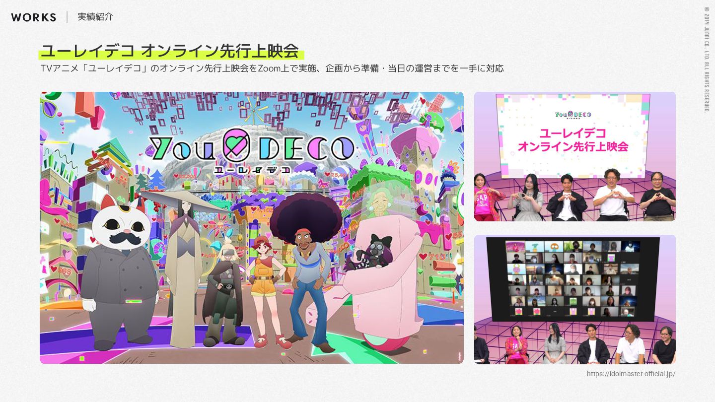 ユーレイデコ オンライン先行上映会 TVアニメ「ユーレイデコ」のオンライン先行上映会をZoom上で実施、企画から準備・当日の運営までを一手に対応 https://idolmaster-official.jp/ 実績紹介