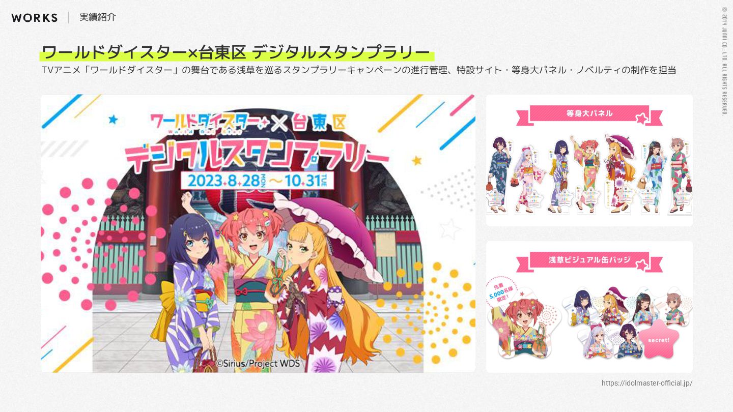 ワールドダイスター×台東区 デジタルスタンプラリー TVアニメ「ワールドダイスター」の舞台である浅草を巡るスタンプラリーキャンペーンの進行管理、特設サイト・等身大パネル・ノベルティの制作を担当 https://idolmaster-official.jp/ 実績紹介