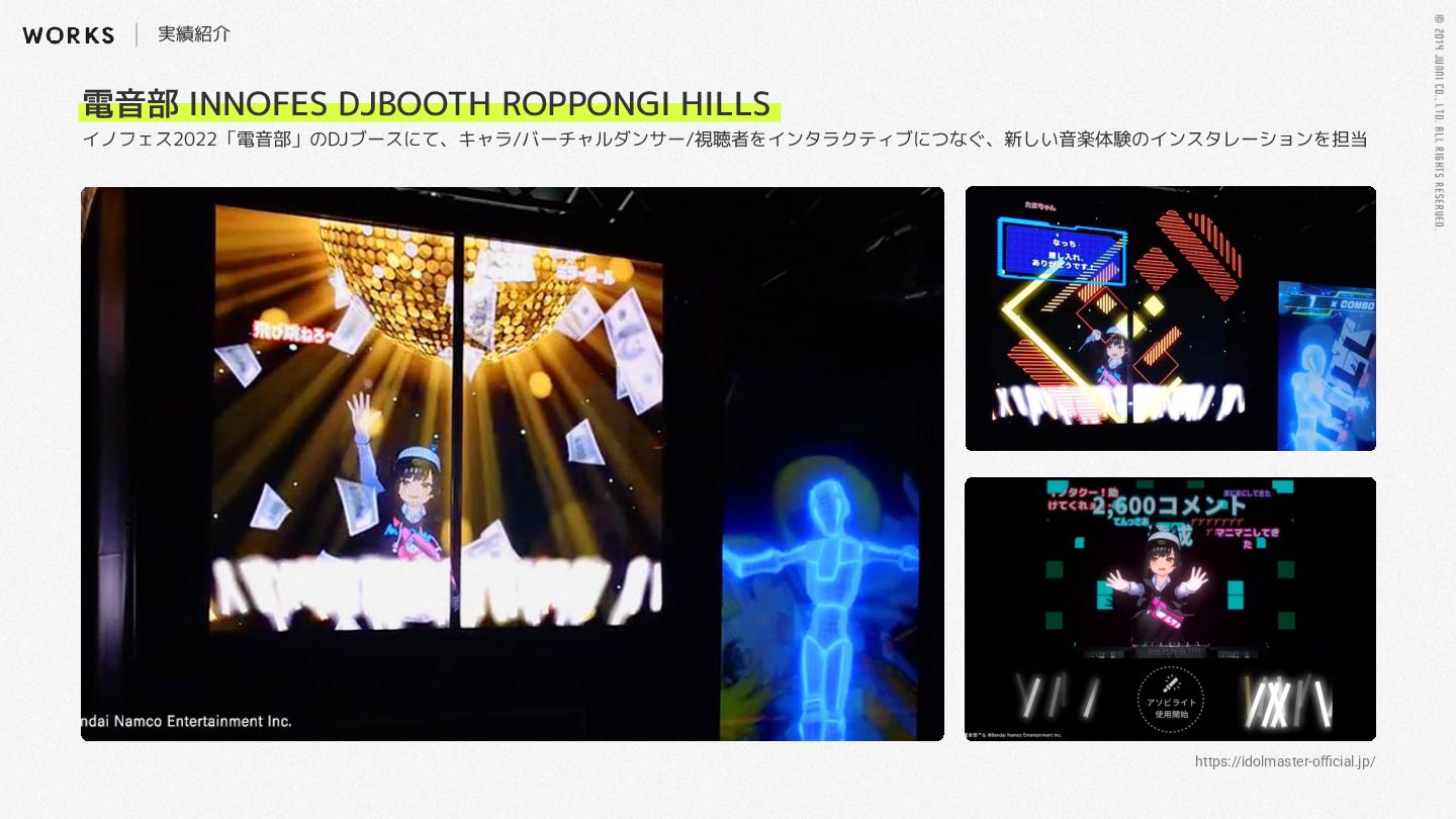 電音部 INNOFES DJBOOTH ROPPONGI HILLS イノフェス2022「電音部」のDJブースにて、キャラ/バーチャルダンサー/視聴者をインタラクティブにつなぐ、新しい音楽体験のインスタレーションを担当 https://idolmaster-official.jp/ 実績紹介