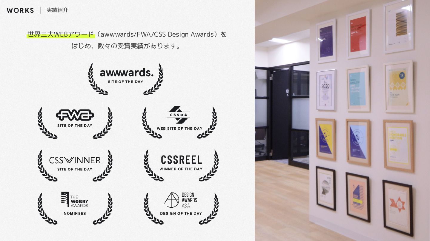 世界三大WEBアワード(awwwards/FWA/CSS Design Awards)を はじめ、数々の受賞実績があります。 実績紹介