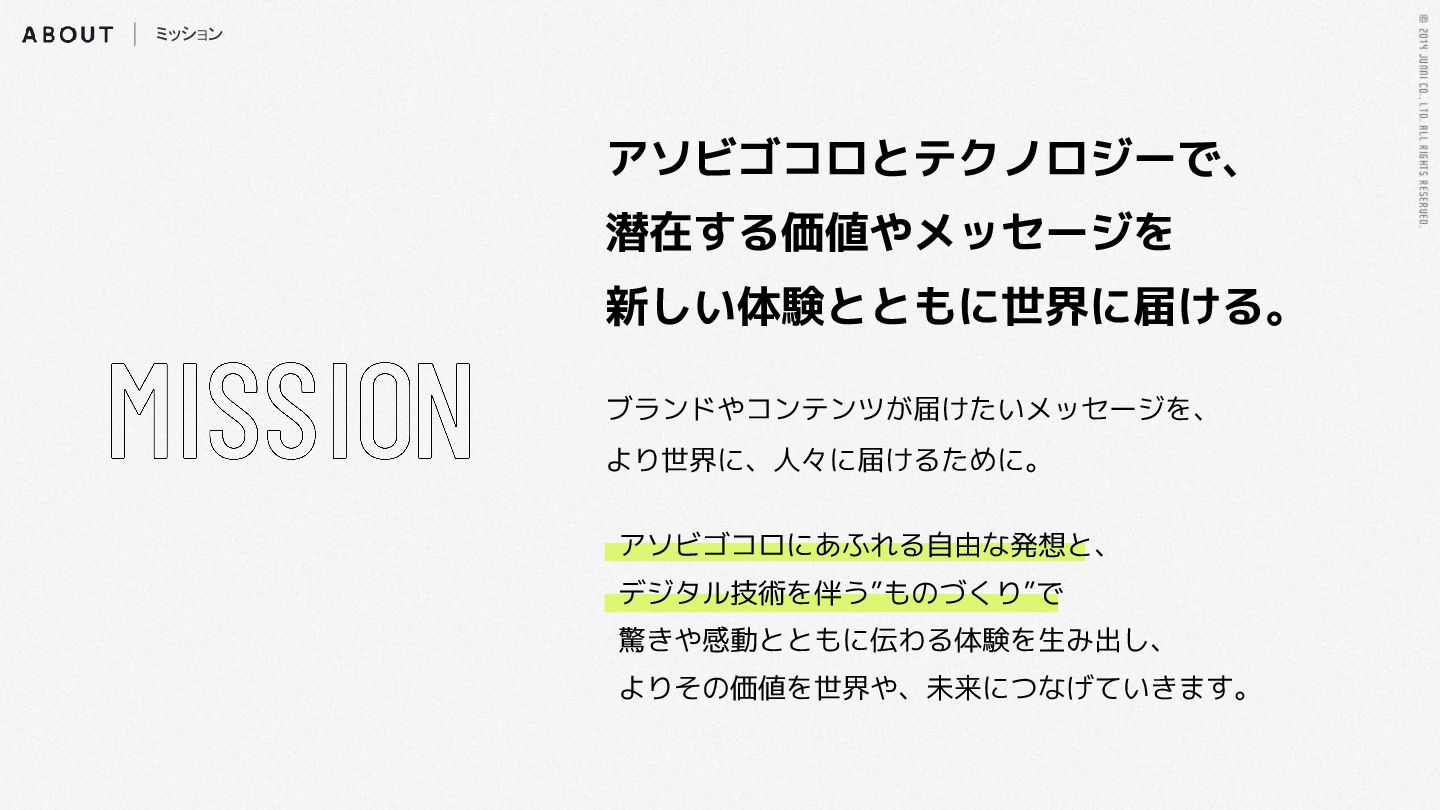 ミッション アソビゴコロとテクノロジーで、 潜在する価値やメッセージを 新しい体験とともに世界に届ける。 ブランドやコンテンツが届けたいメッセージを、 より世界に、人々に届けるために。 アソビゴコロにあふれる自由な発想と、 デジタル技術を伴う”ものづくり”で 驚きや感動とともに伝わる体験を生み出し、 よりその価値を世界や、未来につなげていきます。