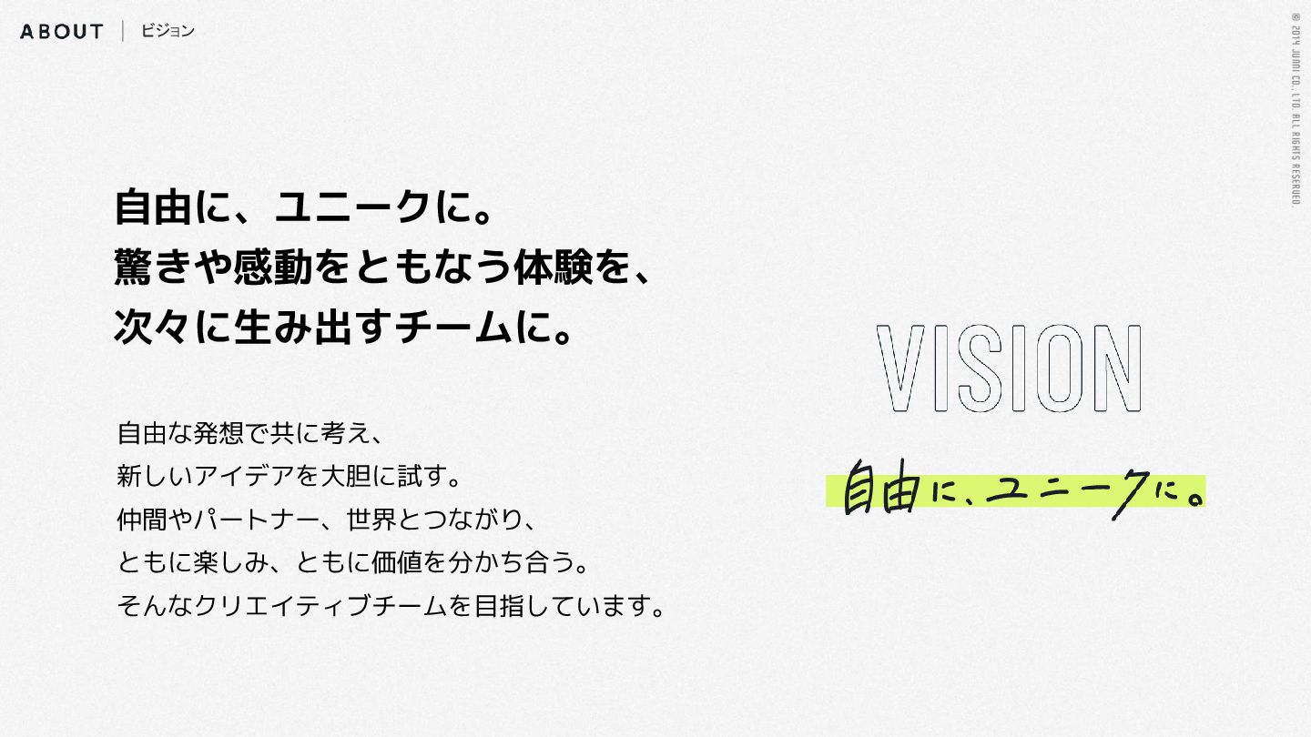 自由な発想で共に考え、 新しいアイデアを大胆に試す。 仲間やパートナー、世界とつながり、 ともに楽しみ、ともに価値を分かち合う。 そんなクリエイティブチームを目指しています。 自由に、ユニークに。 驚きや感動をともなう体験を、 次々に生み出すチームに。 ビジョン