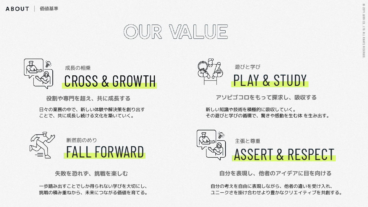 日々の業務の中で、新しい体験や解決策を創り出す ことで、共に成長し続ける文化を築いていく。 価値基準 成長の相乗 役割や専門を超え、共に成長する 新しい知識や技術を積極的に吸収していく。 その遊びと学びの循環で、驚きや感動を生む体 を生み出す。 遊びと学び アソビゴコロをもって探求し、吸収する