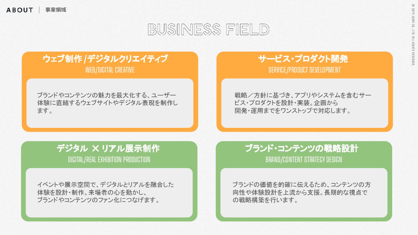 リアル展示制作 SERVICE/PRODUCT DEVELOPMENT サービス・プロダクト開発 BRAND/CONTENT STRATEGY DESIGN ブランド・コンテンツの戦略設計 ブランドやコンテンツの魅力を最大化する、ユーザー 体験に直結するウェブサイトやデジタル表現を制作し ます。 戦略/方針に基づき、アプリやシステムを含むサー ビス・プロダクトを設計・実装。企画から 開発・運用までをワンストップで対応します。 イベントや展示空間で、デジタルとリアルを融合した 体験を設計・制作。来場者の心を動かし、 ブランドやコンテンツのファン化につなげます。 ブランドの価値を的確に伝えるため、コンテンツの方 向性や体験設計を上流から支援。長期的な視点で の戦略構築を行います。