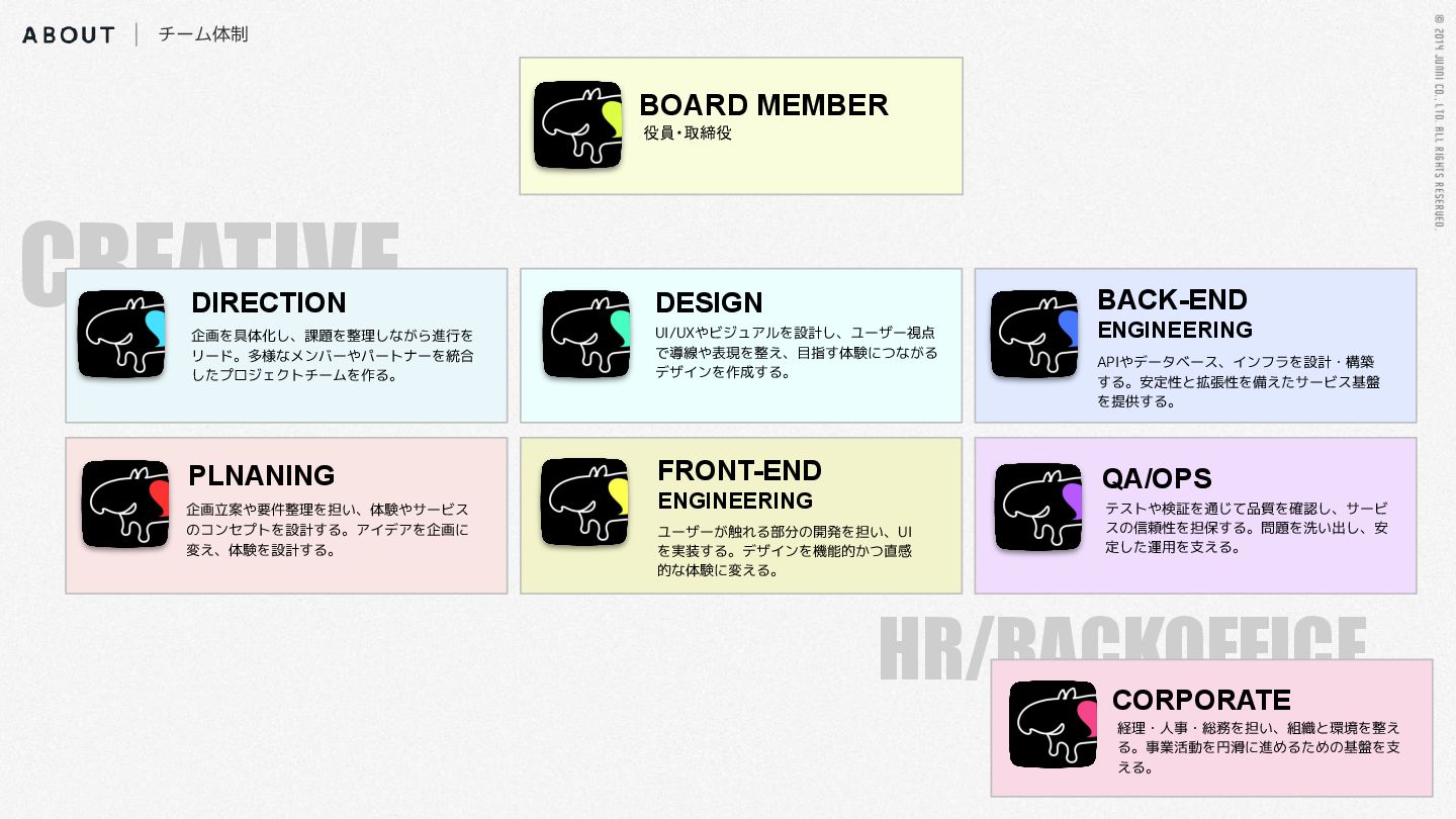 HR/BACKOFFICE CREATIVE チーム体制 QA/OPS FRONT-END ENGINEERING DIRECTION DESIGN BOARD MEMBER