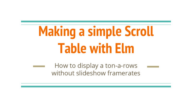 13. Resources Repo: https://github.com/justinwoo/elm-scroll-table/ Elm: elm-lang.org Old blag post: http://qiita.com/kimagure/items/57cdd08bdf56cc51d294 In