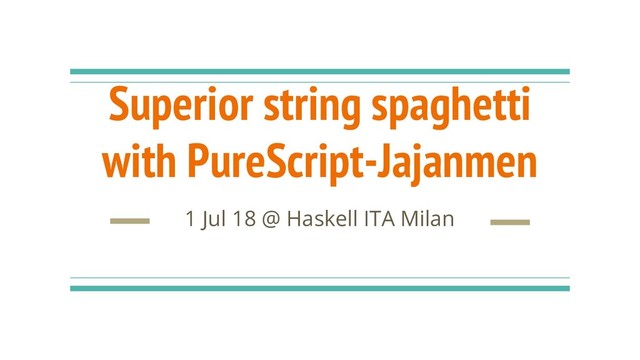 a complete picture of how to parse Symbols • We can use this to extract specific labels to construct a record type for the parameters in our queries • Hence, PureScript-Jajanmen getEm :: forall a b. AllowedParamType a => AllowedParamType b => DBConnection -> { "$name" :: a, "$count" :: b } -> Aff Foreign getEm db = J.queryDB db queryP where queryP = SProxy :: SProxy "select name, count from mytable where name = $name and count = $count"