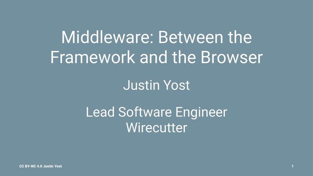 Limiting into Middleware • Build say a standard set of responses for generic queries into Middleware • Build an entire CRUD application using Middleware, sure. CC BY-NC 4.0 Justin Yost 7