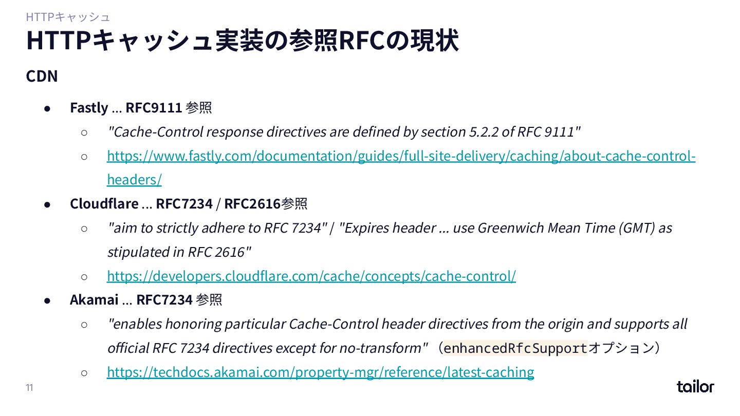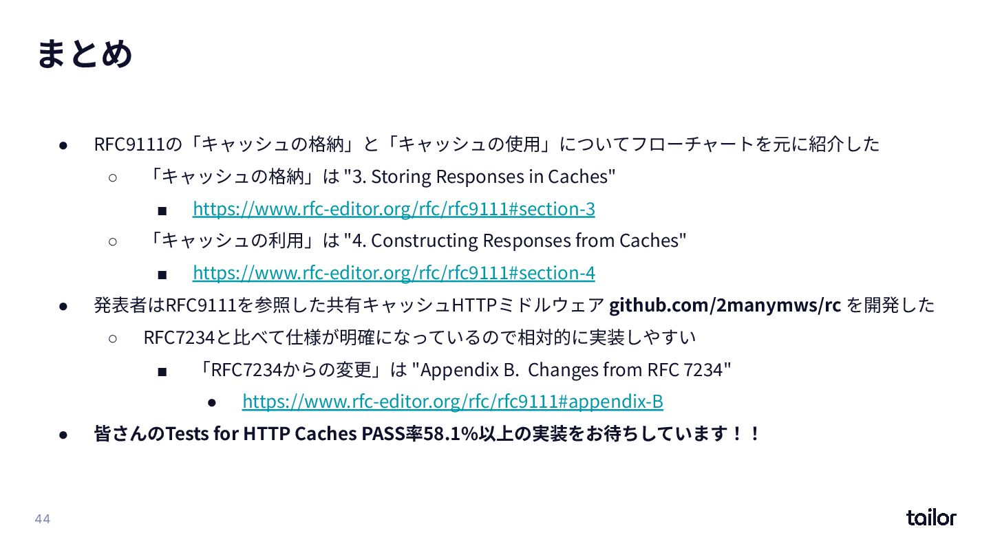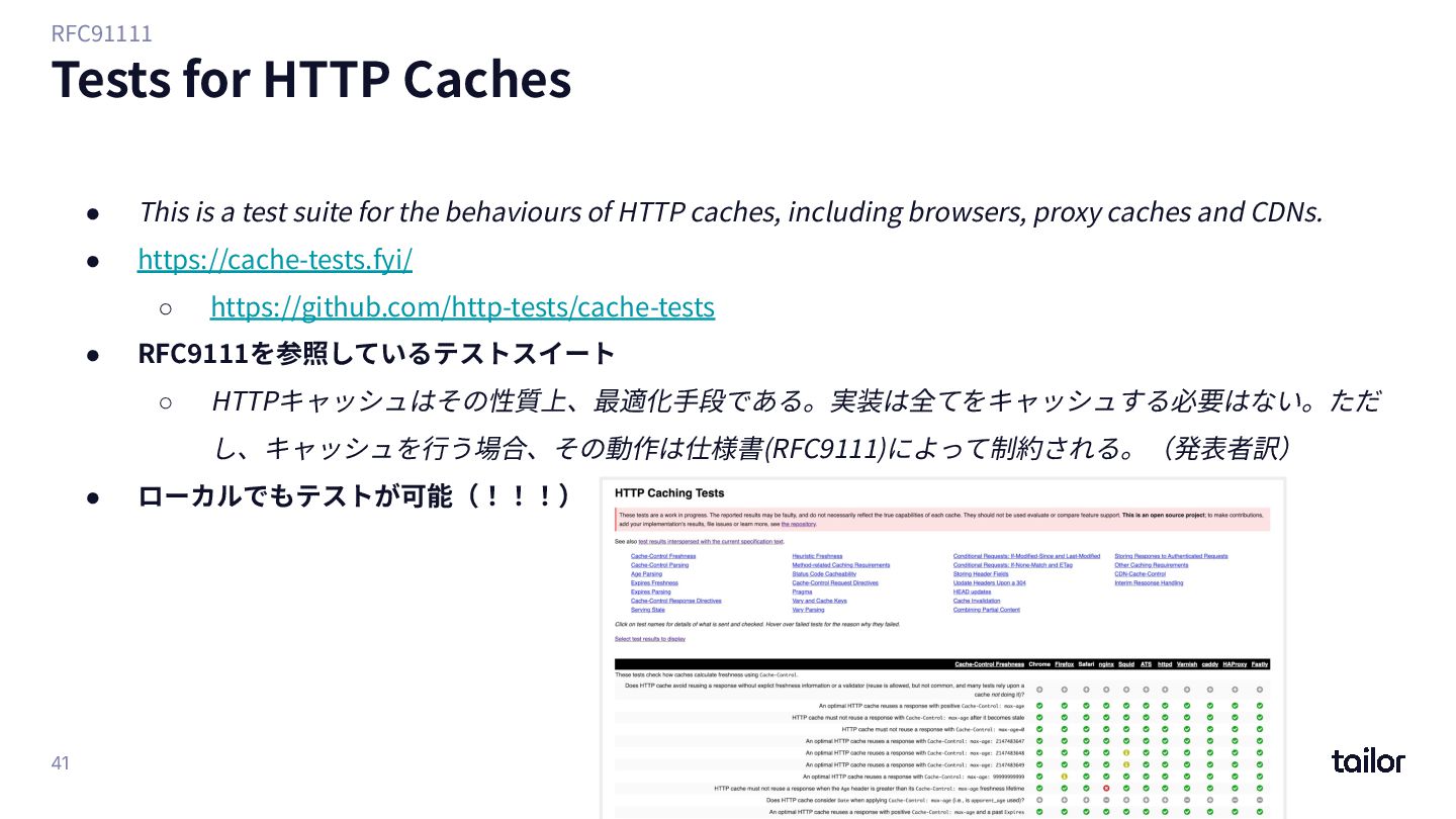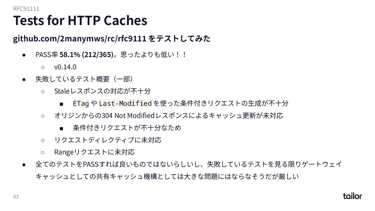 HTTP caches, including browsers, proxy caches and CDNs. • https://cache-tests.fyi/ ◦ https://github.com/http-tests/cache-tests • RFC9111を参照しているテストスイート ◦ HTTPキャッシュはその性質上、最適化⼿段である。実装は全てをキャッシュする必要はない。ただ し、キャッシュを⾏う場合、その動作は仕様書(RFC9111)によって制約される。(発表者訳) • ローカルでもテストが可能(!!!) Tests for HTTP Caches RFC91111 41