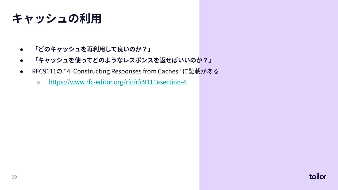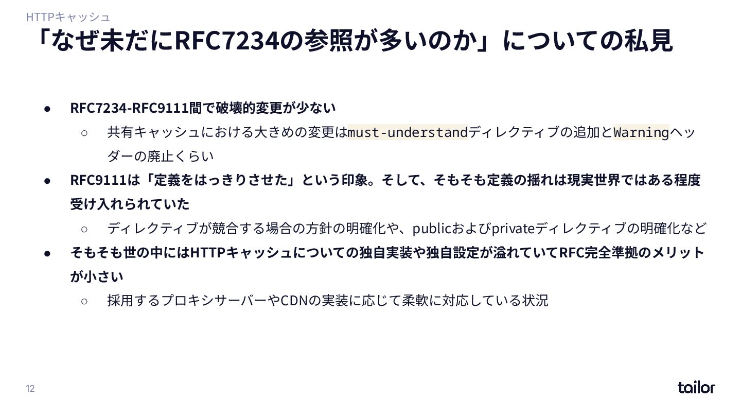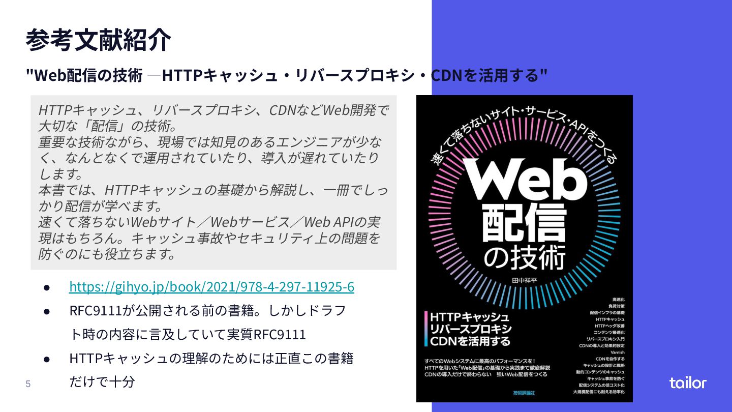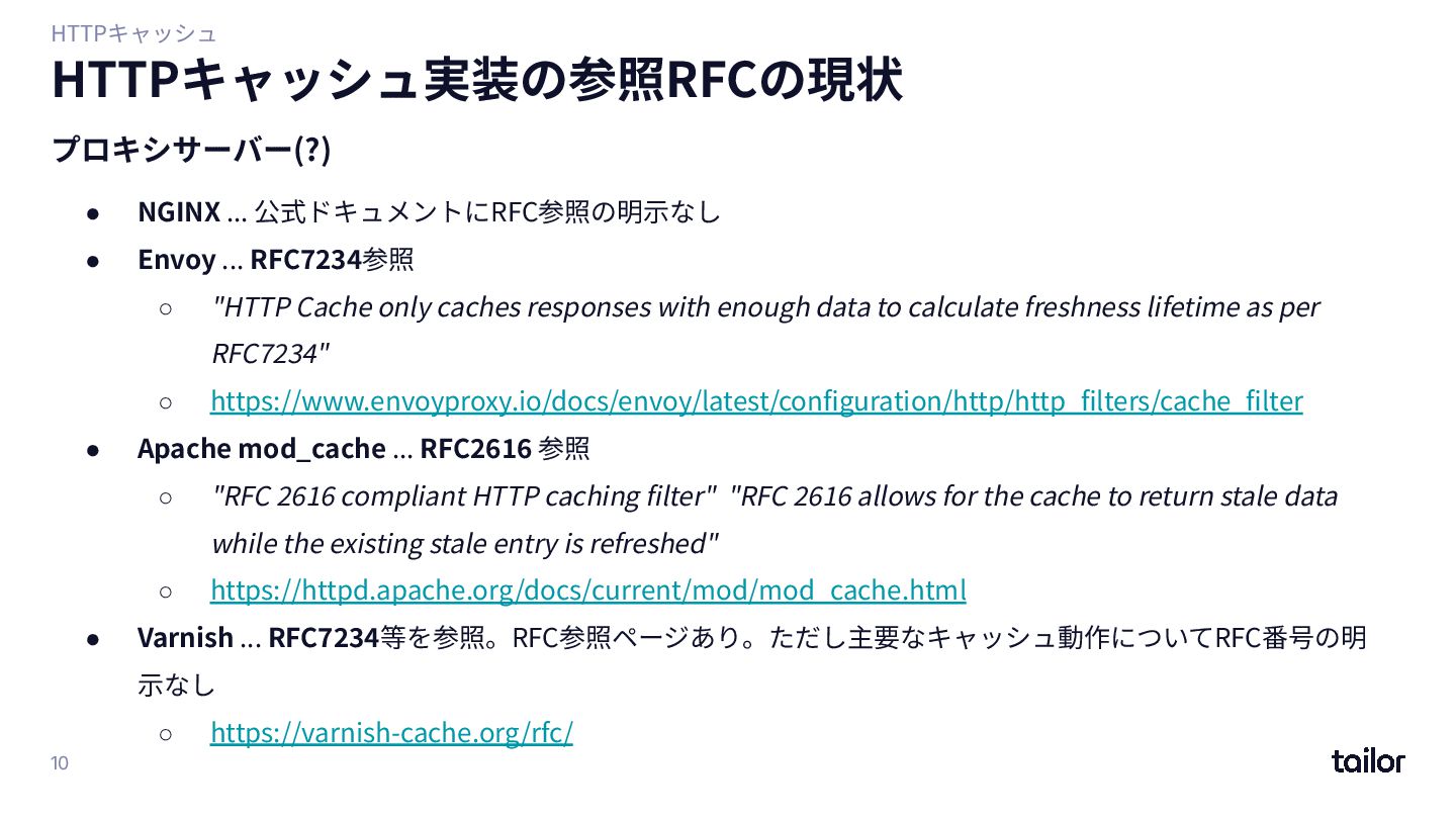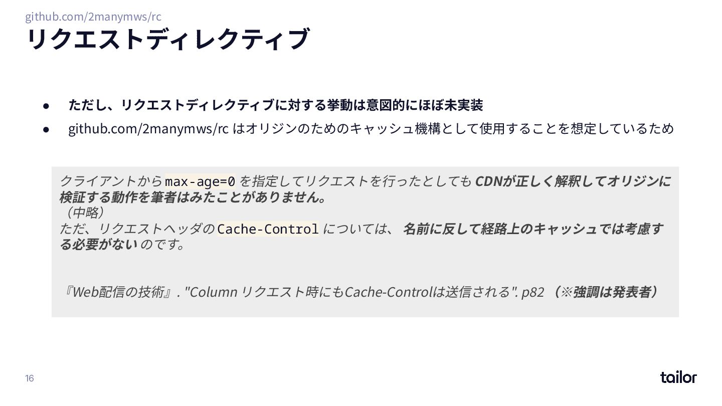HTTP caches, including browsers, proxy caches and CDNs. • https://cache-tests.fyi/ ◦ https://github.com/http-tests/cache-tests • RFC9111を参照しているテストスイート ◦ HTTPキャッシュはその性質上、最適化⼿段である。実装は全てをキャッシュする必要はない。ただ し、キャッシュを⾏う場合、その動作は仕様書(RFC9111)によって制約される。(発表者訳) • ローカルでもテストが可能(!!!) Tests for HTTP Caches RFC91111 41