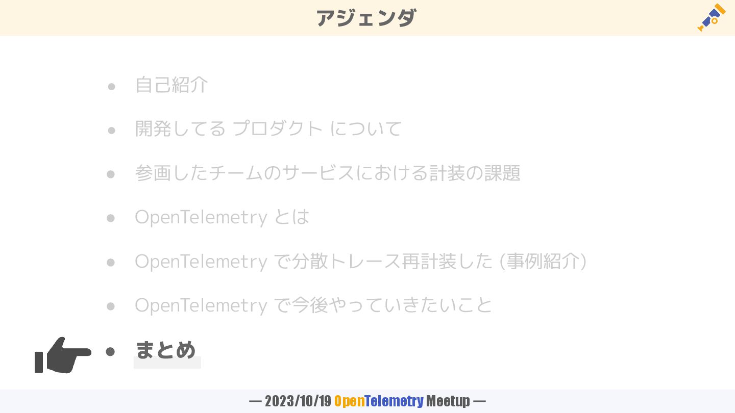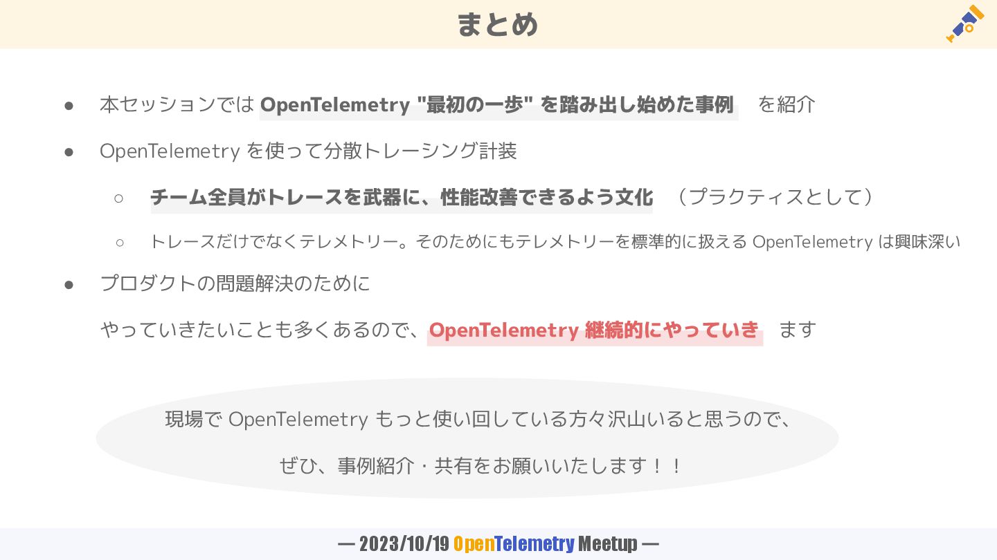 contains many components, it is a good starting point to try various configurations. However, when running in production, it is recommended to limit the collector to contain only the components necessary for an environment https://github.com/open-telemetry/opentelemetry-collector-releases/tree/main/distributions/otelcol-contrib#recommendation • Contribution Distro. には全てのコンポーネントが含まれているため商用利用は非 推奨 • 標準 Distro. に含まれないコンポーネントを使いたい場合は、 ◦ 使うコンポーネントを含む Custom OpenTelemetry Collector をビルドする ▪ ビルドツールは公式で提供されている:OpenTelemetry Collector Builder (ocb) ◦ モニタリングベンダーより提供されている Distro. を使う ▪ ADOT Collector (AWS), splunk-otel-collector (Splunc) などなど... 先述の通り、OpenTelemetry Collector には 2 つの Dstribution が存在 しています。 ・標準 Distro. : https://github.com/open-telemetry/opentelemetry-collector-releases/tree/main/distributions/otelcol ・Contribution Distro. : https://github.com/open-telemetry/opentelemetry-collector-releases/tree/main/distributions/otelcol-contrib