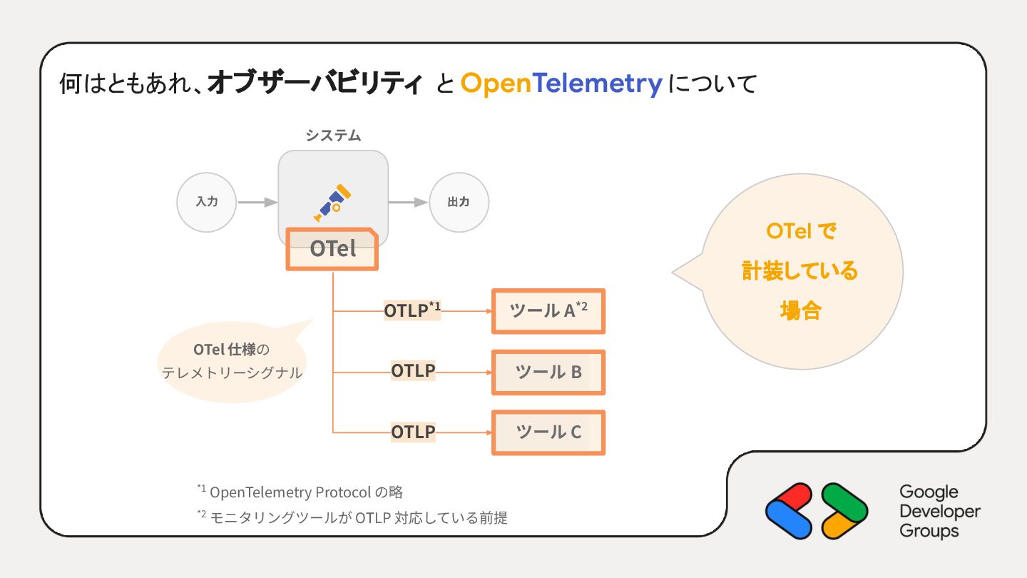 A*2 ツール C OTel *1 OpenTelemetry Protocol の略 *2 モニタリングツールが OTLP 対応している前提 OTel 仕様の テレメトリーシグナル OTLP*1 OTLP OTLP OTel で 計装している 場合