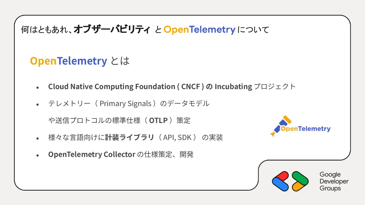 Foundation ( CNCF ) の Incubating プロジェクト • テレメトリー( Primary Signals )のデータモデル や送信プロトコルの標準仕様( OTLP )策定 • 様々な⾔語向けに計装ライブラリ( API, SDK ) の実装 • OpenTelemetry Collector の仕様策定、開発