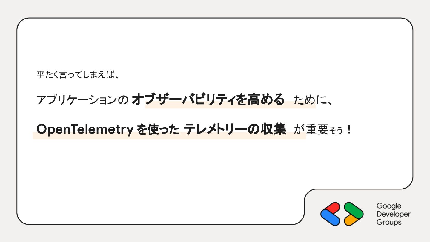 平たく言ってしまえば、 アプリケーションの オブザーバビリティを高める ために、 OpenTelemetry を使った テレメトリーの収集 が重要そう!