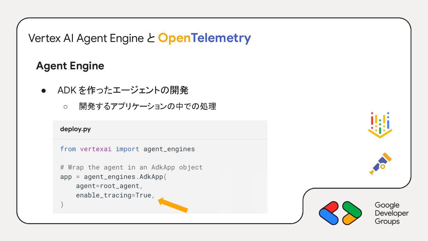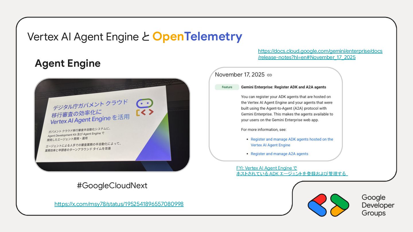 Vertex AI Agent Engine と OpenTelemetry Agent Engine #GoogleCloudNext https://x.com/msy78/status/1952541896557080998
