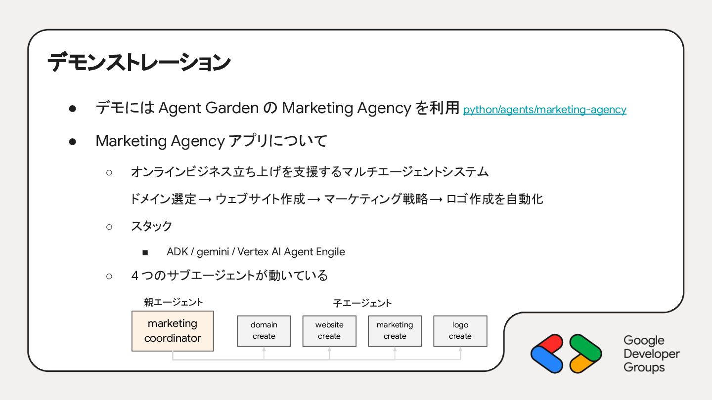 • Marketing Agency アプリについて ◦ オンラインビジネス立ち上げを支援するマルチエージェントシステム ドメイン選定 → ウェブサイト作成 → マーケティング戦略 → ロゴ作成を自動化 ◦ スタック ▪ ADK / gemini / Vertex AI Agent Engile ◦ 4 つのサブエージェントが動いている marketing coordinator domain create website create marketing create logo create 親エージェント 子エージェント