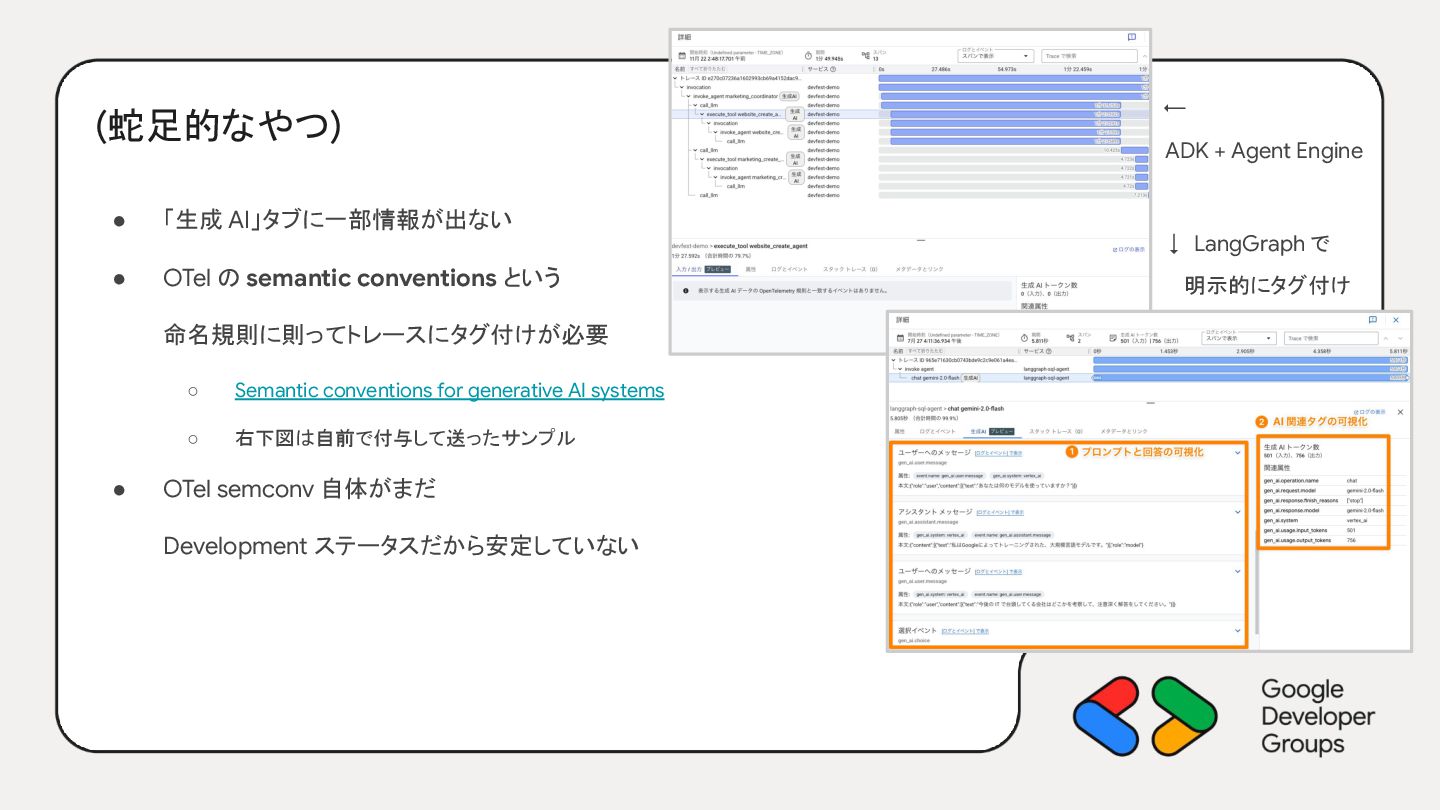 命名規則に則ってトレースにタグ付けが必要 ◦ Semantic conventions for generative AI systems ◦ 右下図は自前で付与して送ったサンプル • OTel semconv 自体がまだ Development ステータスだから安定していない ← ADK + Agent Engine ↓ LangGraph で 明示的にタグ付け