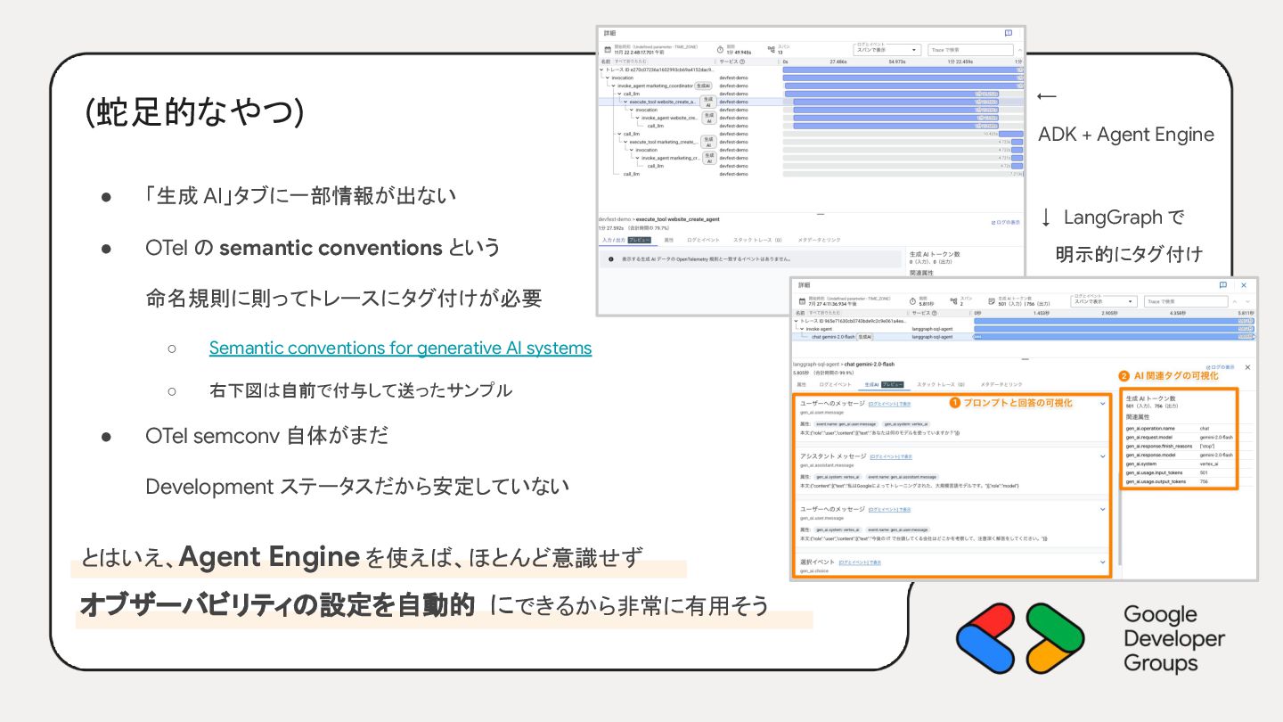 命名規則に則ってトレースにタグ付けが必要 ◦ Semantic conventions for generative AI systems ◦ 右下図は自前で付与して送ったサンプル • OTel semconv 自体がまだ Development ステータスだから安定していない ← ADK + Agent Engine ↓ LangGraph で 明示的にタグ付け とはいえ、Agent Engine を使えば、ほとんど意識せず オブザーバビリティの設定を自動的 にできるから非常に有用そう