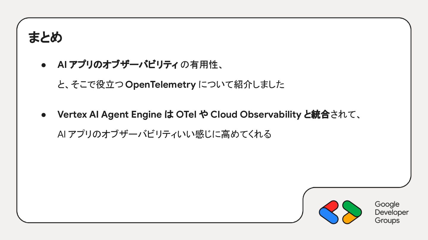 • AI アプリのオブザーバビリティ の有用性、 と、そこで役立つ OpenTelemetry について紹介しました • Vertex AI