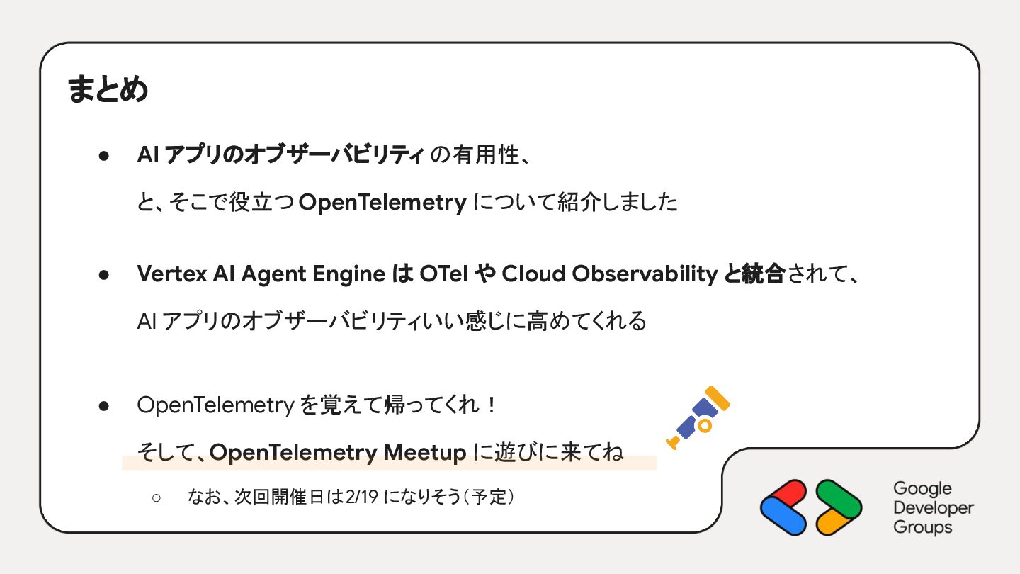 Agent Engine は OTel や Cloud Observability と統合されて、 AI アプリのオブザーバビリティいい感じに高めてくれる • OpenTelemetry を覚えて帰ってくれ! そして、OpenTelemetry Meetup に遊びに来てね ◦ なお、次回開催日は 2/19 になりそう(予定) まとめ
