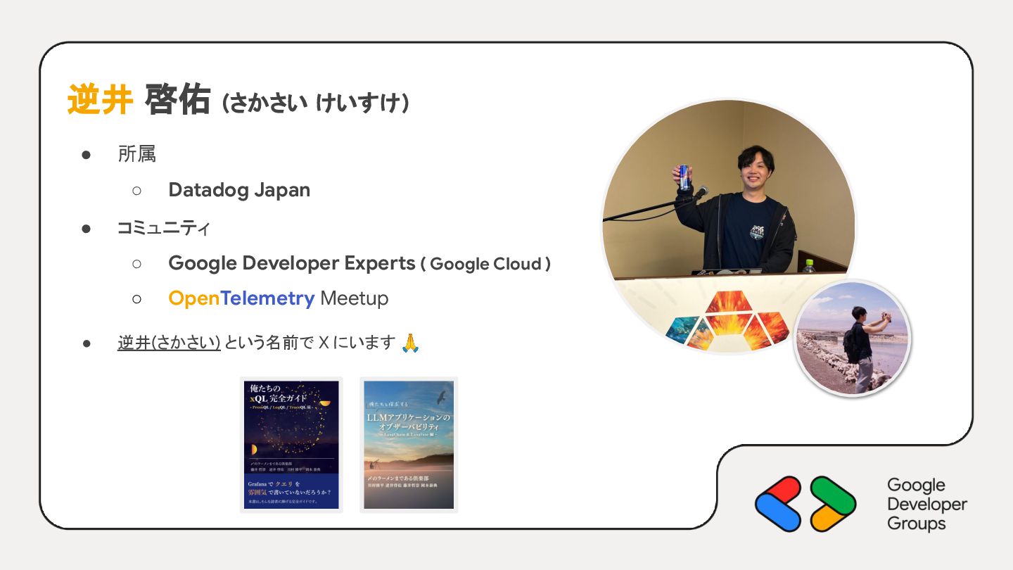 コミュニティ ◦ Google Developer Experts ( Google Cloud ) ◦ OpenTelemetry Meetup • 逆井(さかさい) という名前で X にいます 🙏
