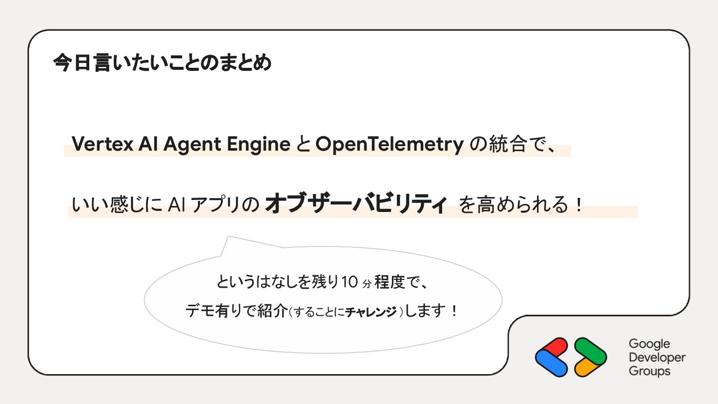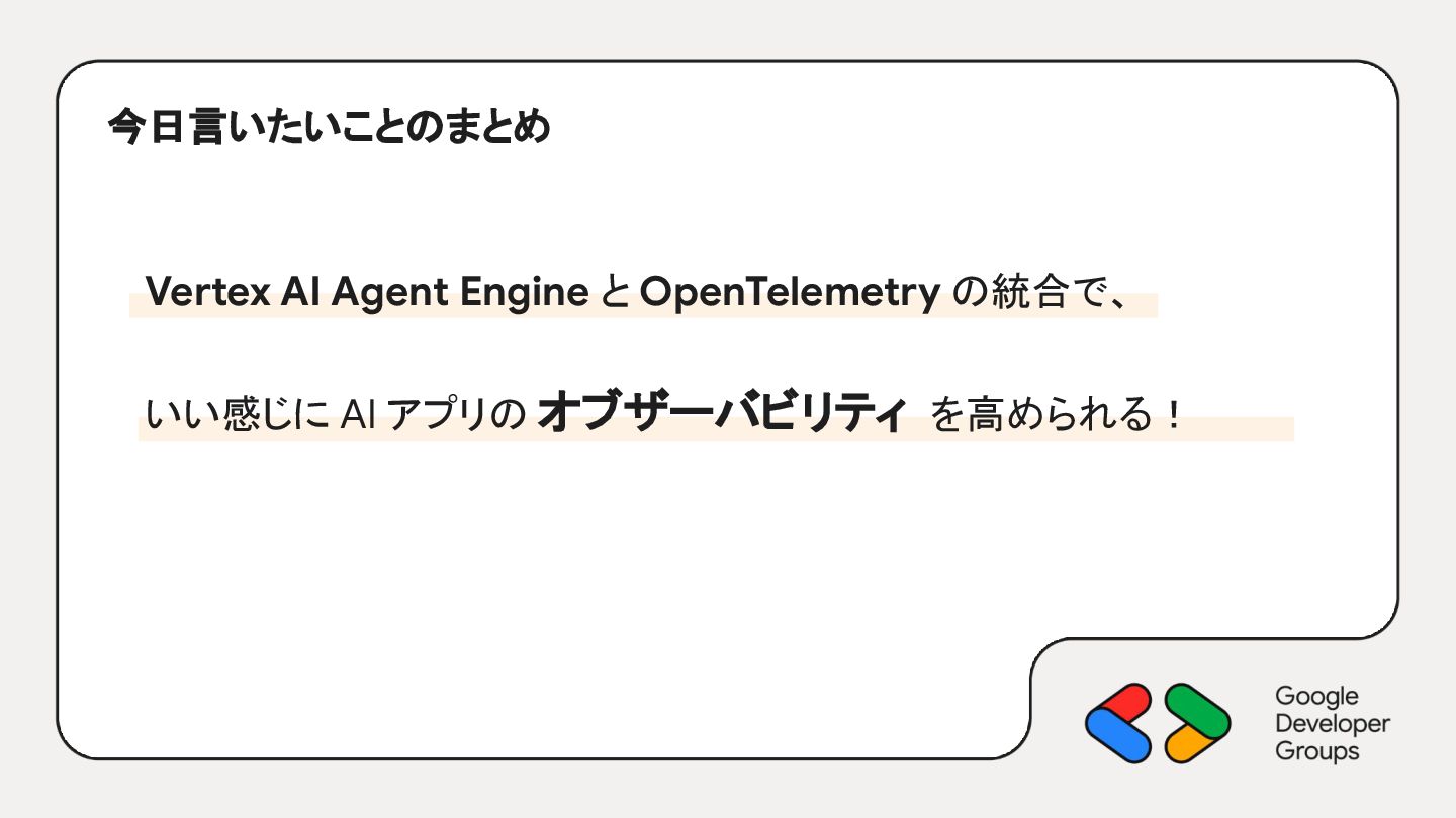 今日言いたいことのまとめ Vertex AI Agent Engine と OpenTelemetry の統合で、 いい感じに AI