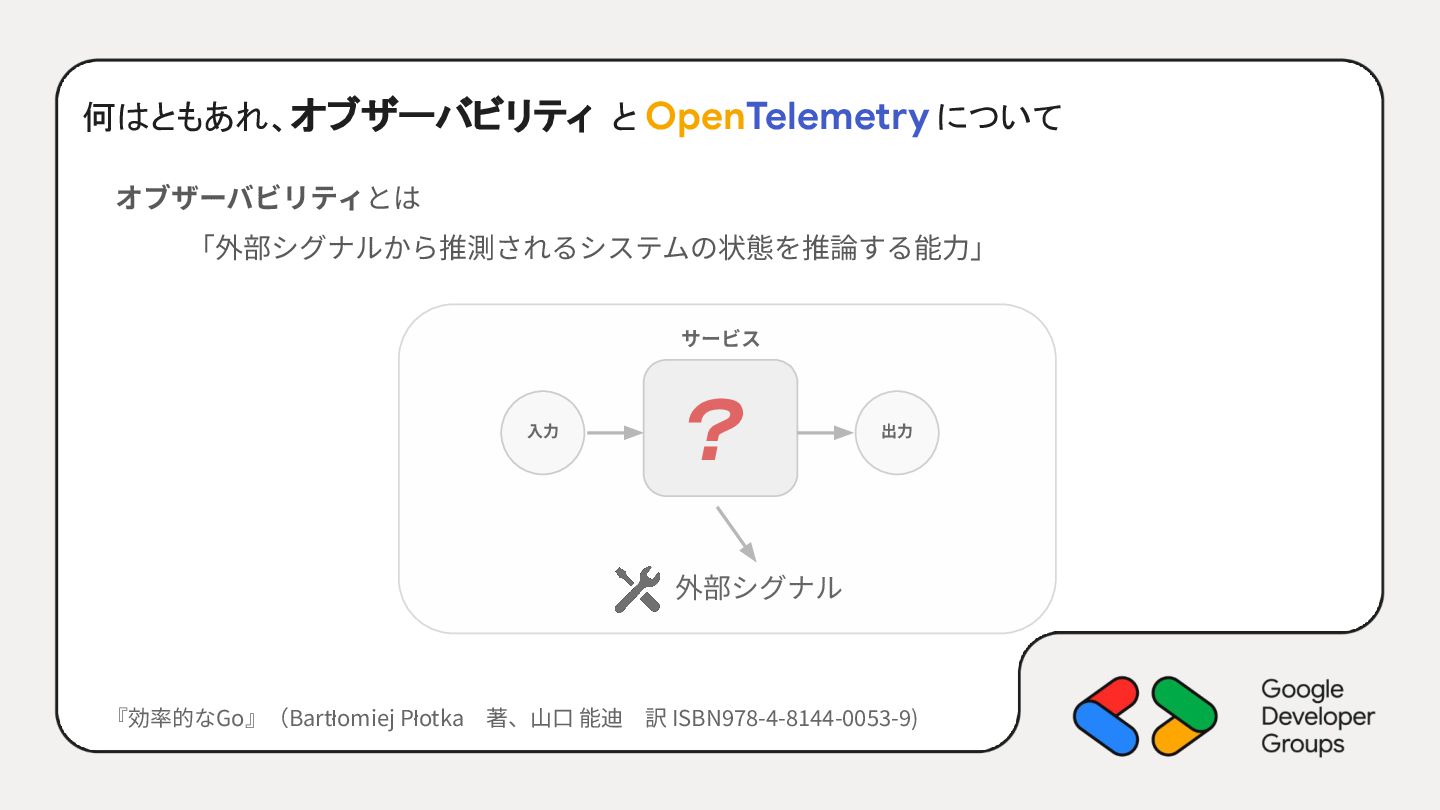 何はともあれ、オブザーバビリティ と OpenTelemetry について オブザーバビリティとは 「外部シグナルから推測されるシステムの状態を推論する能⼒」 『効率的なGo』(Bartłomiej Płotka 著、⼭⼝ 能迪 訳 ISBN978-4-8144-0053-9)