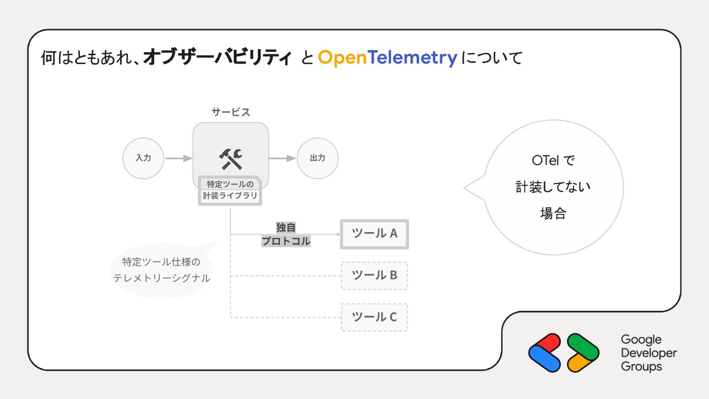 A ツール B ツール C 特定ツール仕様の テレメトリーシグナル 独⾃ プロトコル OTel で 計装してない 場合