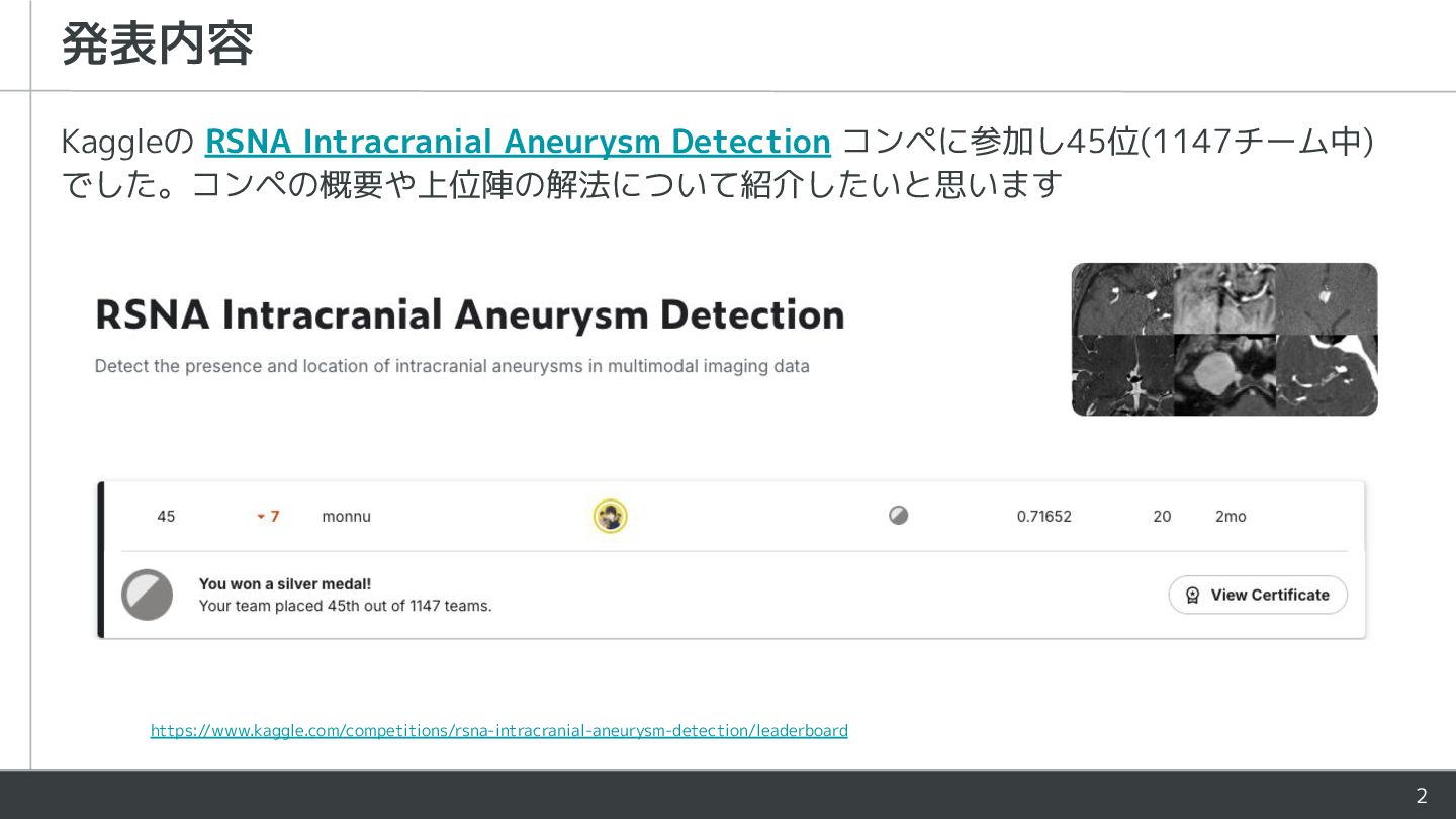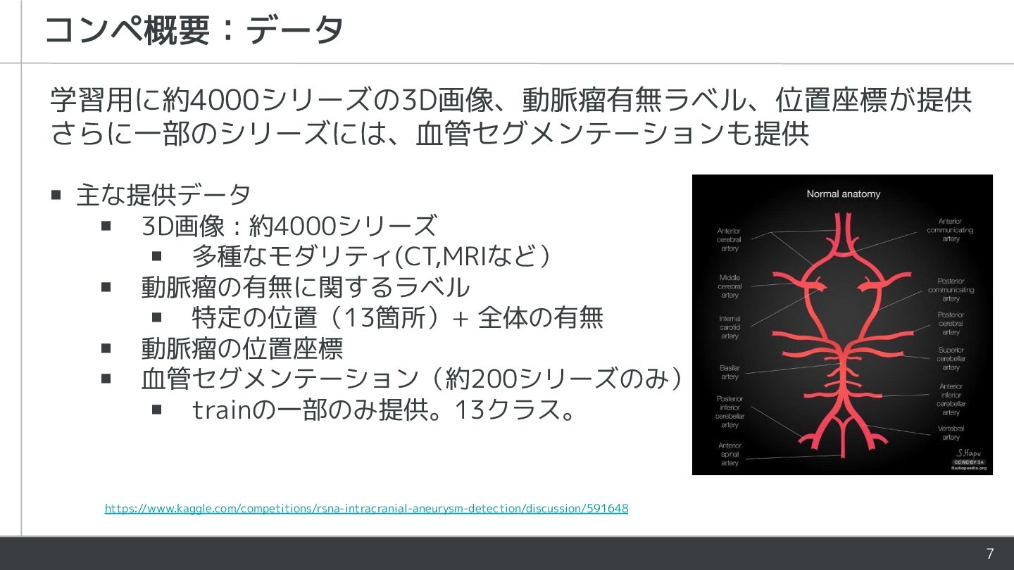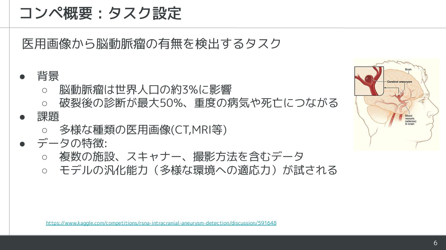 多様な種類の医用画像(CT,MRI等)から動脈瘤を検知 • データの特徴: ◦ 複数の施設、スキャナー、撮影方法を含むデータ ◦ モデルの汎化能力(多様な環境への適応力)が試される コンペ概要 : タスク設定 医用画像から脳動脈瘤の有無を検出するタスク https://www.kaggle.com/competitions/rsna-intracranial-aneurysm-detection/discussion/591648