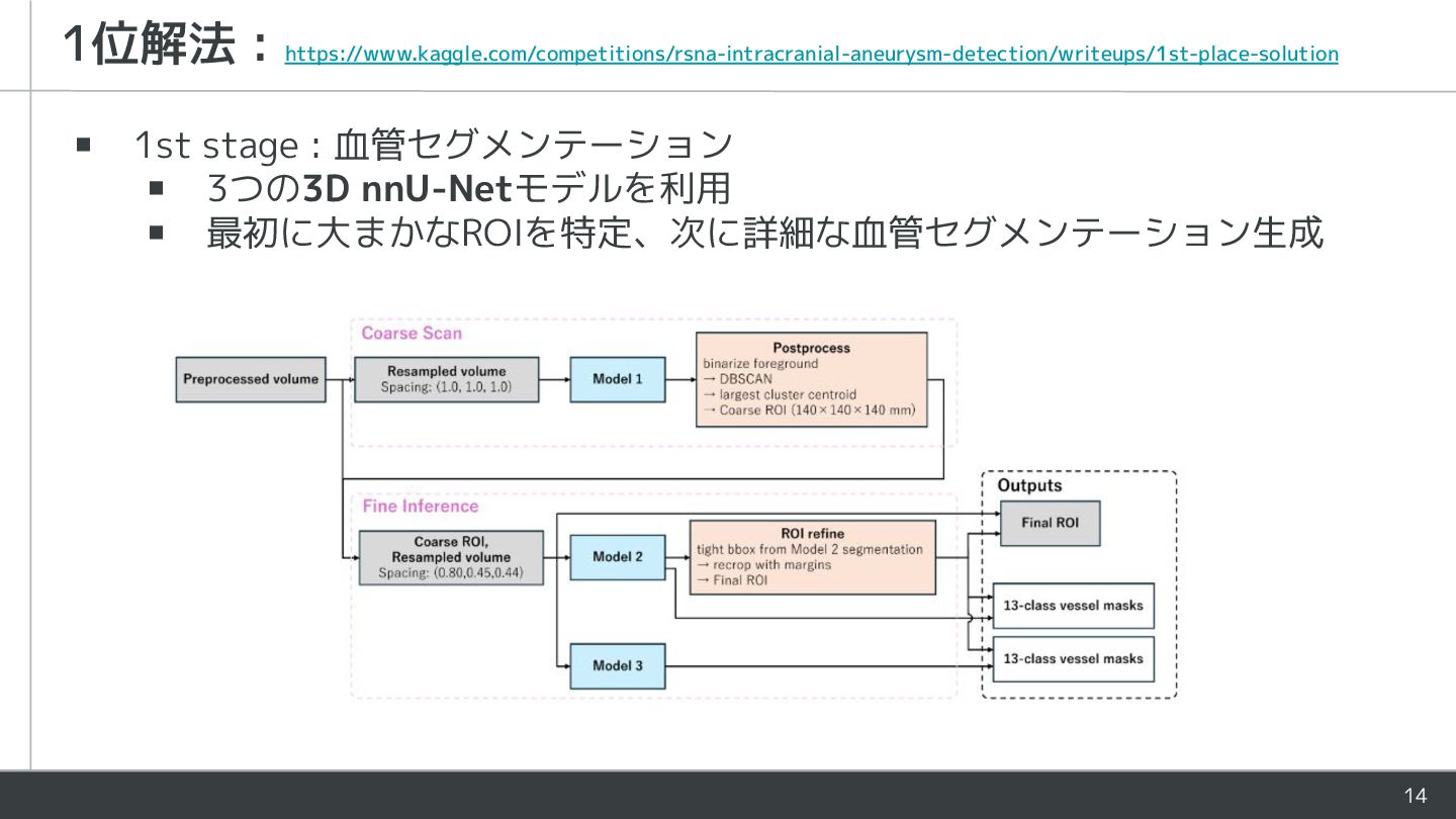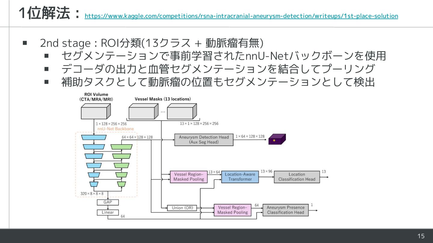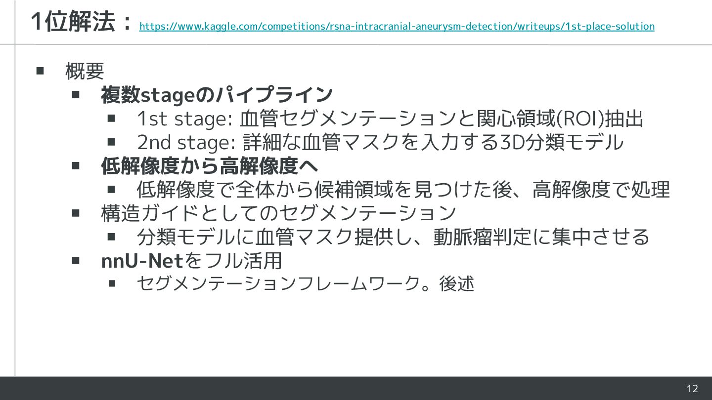 6. 12 1位解法 : https://www.kaggle.com/competitions/rsna-intracranial-aneurysm-detection/writeups/1st-place-solution ▪ 概要 ▪ 複数stageのパイプライン ▪ 1st