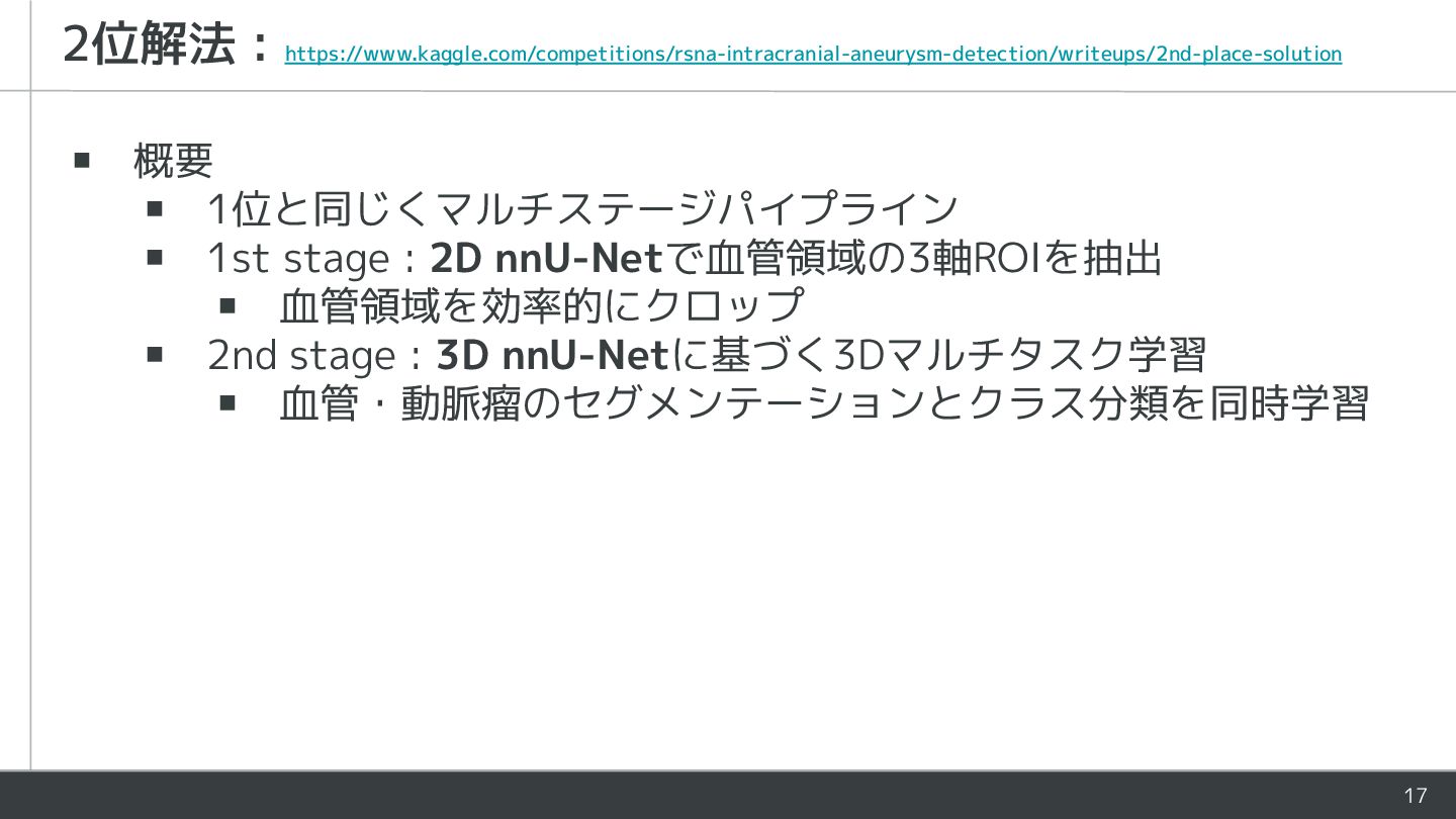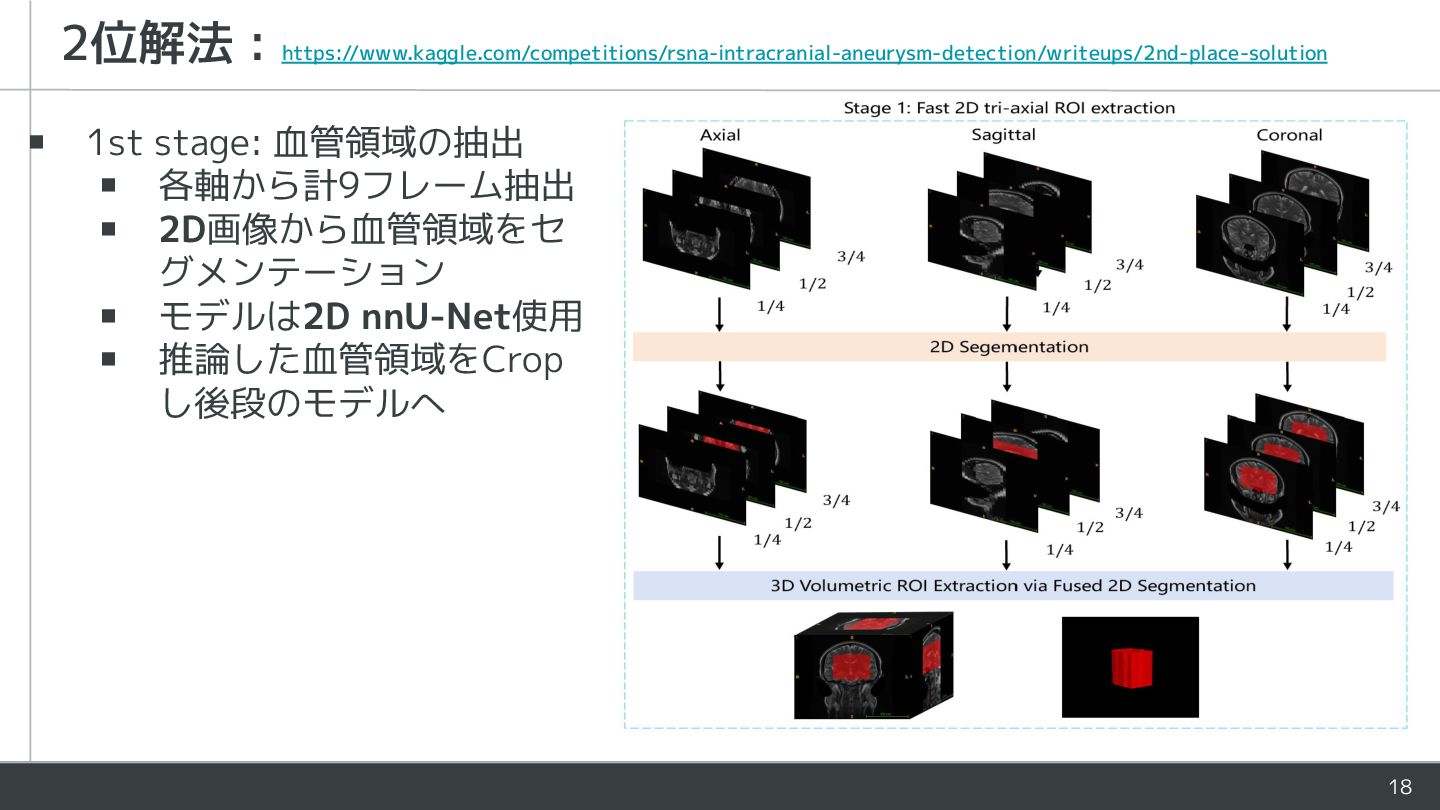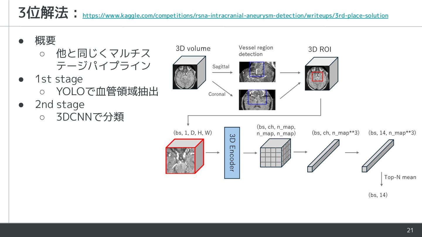 6. 12 1位解法 : https://www.kaggle.com/competitions/rsna-intracranial-aneurysm-detection/writeups/1st-place-solution ▪ 概要 ▪ 複数stageのパイプライン ▪ 1st