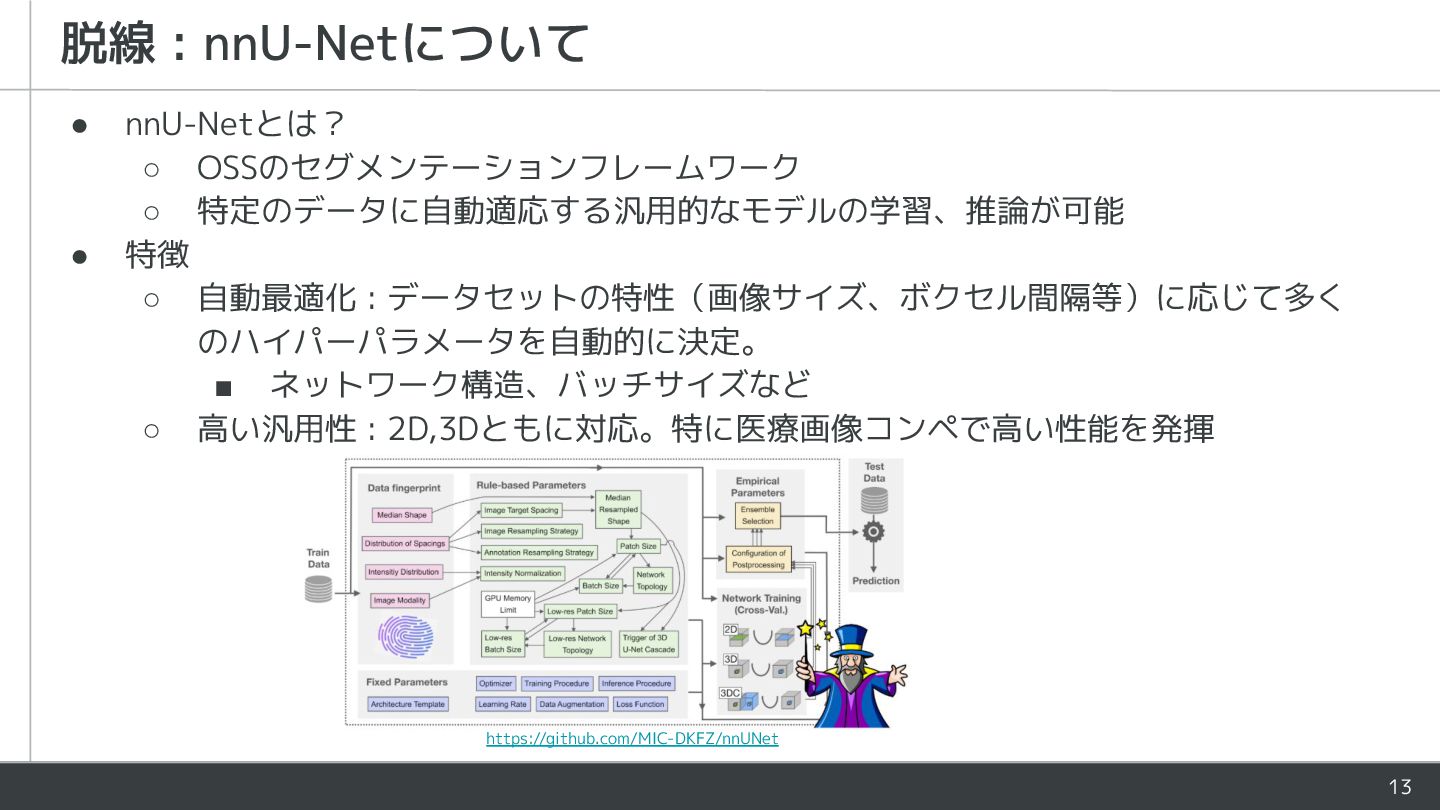 7. 13 • nnU-Netとは? ◦ OSSのセグメンテーションフレームワーク ◦ 特定のデータに自動適応する汎用的なモデルの学習、推論が可能 • 特徴 ◦