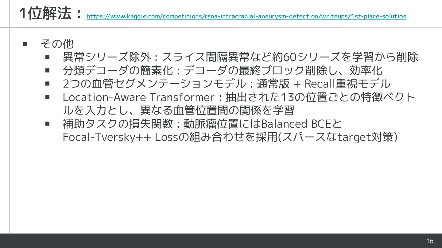 デコーダの最終ブロック削除し、効率化 ▪ 2つの血管セグメンテーションモデル : 通常版 + Recall重視モデル ▪ Location-Aware Transformer : 抽出された13の位置ごとの特徴ベクト ルを入力とし、異なる血管位置間の関係を学習 ▪ 補助タスクの損失関数 : 動脈瘤位置にはBalanced BCEと Focal-Tversky++ Lossの組み合わせを採用(スパースなtarget対策) 1位解法 : https://www.kaggle.com/competitions/rsna-intracranial-aneurysm-detection/writeups/1st-place-solution