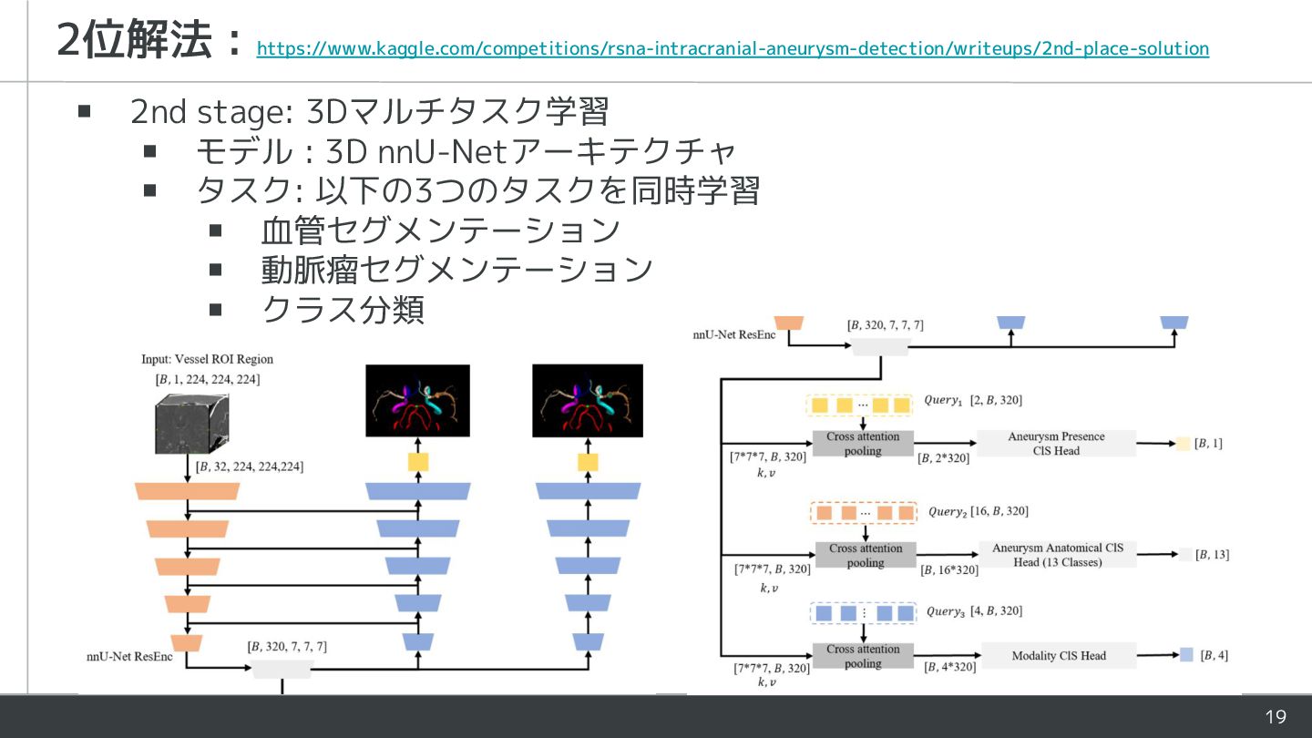 nnU-Netで血管領域の3軸ROIを抽出 ▪ 血管領域を効率的にクロップ ▪ 2nd stage : 3D nnU-Netに基づく3Dマルチタスク学習 ▪ 血管・動脈瘤のセグメンテーションとクラス分類を同時学習 2位解法 : https://www.kaggle.com/competitions/rsna-intracranial-aneurysm-detection/writeups/2nd-place-solution